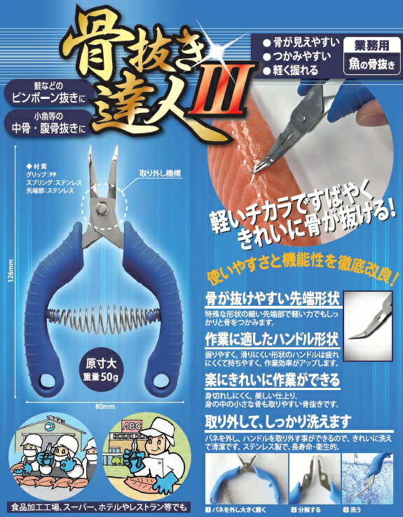 軽いチカラですばやくきれいに骨が抜ける! 使いやすさと機能性を徹底改良!! ◆骨が抜けやすい先端形状 特殊な形状の細い先端部で軽い力でもしっかりと骨をつかみます。 ◆作業に適したハンドル形状 握りやすく、滑りにくい形状のハンドルは疲れにくくて持ちやすく、作業効率がアップします。 ◆楽にきれいに作業ができる 身切れしにくく、美しい仕上がり。 身の中の小さな骨も取りやすい骨抜きです。 ◆取り外して、しっかり洗えます バネを外し、ハンドルを取り外す事ができるので、きれいに洗えて清潔です。ステンレス製で、長寿命・衛生的。 [ 仕様 ] ◇寸法:長さ126mm 巾80mm ◇重量:80g