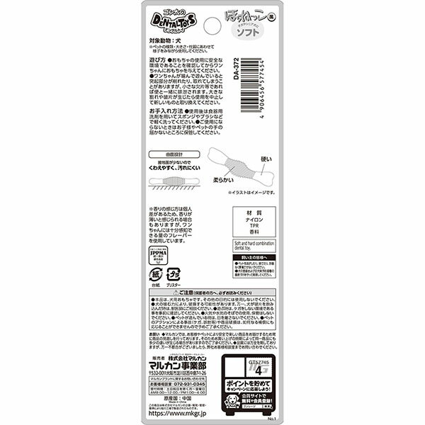 遊んで噛んでデンタルケア!ナイロンとTPRの2種の硬さの樹脂を組合せて噛みごたえの違いを付けた犬用のかじるおもちゃです。・接地面の少ない曲面設計でくわえやすい・汚れにくい・子犬やシニア犬にも安心なソフトタイプ・ワンちゃんが大好きなミルクフレーバーで飽きずに遊べる[お手入れ方法]・使用後は食器用洗剤を用いてスポンジやブラシなどで軽く洗ってください。・ご使用にならないときはお子様やペットの手の届かないところに保管してください。・生産地:中国・素材:ナイロン、TPR、香料