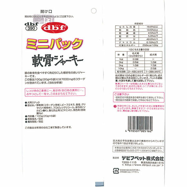豚の軟骨を食べやすい角切りにした嗜好性の良いジャーキーです。この製品100g(20g×5袋)には7000mgのコラーゲンが含まれています。・生産地:日本・素材:<原材料>豚軟骨(コラーゲン含有)、ビーフエキス、食塩、グリセリン(植物性)、プロピレングリコール、保存料(ソルビン酸K)、酸化防止剤(ビタミンC)、発色剤(亜硝酸Na)<保証成分>粗たん白質16.0%以上、粗脂肪10.5%以上、粗繊維0.5%以下、粗灰分5.0%以下、水分48.0%以下、ナトリウム0.70%以下エネルギー:260kcal/100g