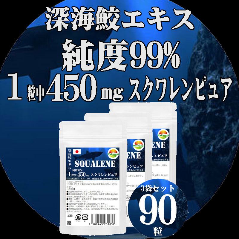 スクワレンピュア30粒 3袋セット計90粒 純度99% 1粒中 深海鮫エキス 450mg配合 スクワレンとは深海鮫の肝油 ソフトカプセル 純度99%のスクワレンを、一切の添加物を加えずにピュアなままカプセルに 大型ソフトカプセル 長径15mm×直径9mm