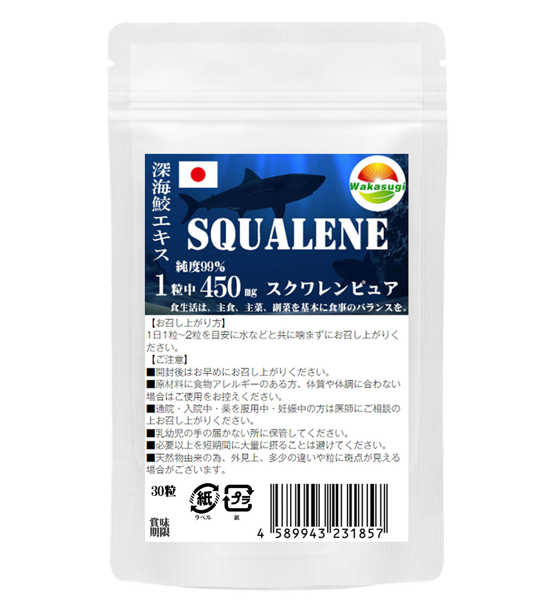 WAKASUGI 若杉サプリ 深海鮫エキス スクワレンピュア 純度99% 1粒中450mg配合 □名称 深海鮫肝油精製抽出エキス含有加工食品 □原材料名 深海鮫肝油精製抽出エキス(国内製造)、 ゼラチン/グリセリン □内容量 内容量:18.6g(1粒重量620mg[内容量450mg]×30粒) □保存方法 直射日光、高温多湿を避け冷暗所に □お召し上がり方 1日1~6粒を目安に水などと共にお召し上がりください。 □お召し上がり方 1日1~6粒を目安に水などと共にお召し上がりください。 □ご注意 ■開封後はお早めにお召し上がりください。 ■原材料に食物アレルギーのある方、体質や体調に合わない 場合はご使用をお控えください。 ■通院・入院中・薬を服用中・妊娠中の方は医師にご相談の 上お召し上がりください。 ■乳幼児の手の届かない所に保管してください。 ■必要以上を短期間に大量に摂ることは避けてください。 ■天然物由来の為、外見上、多少の違いがある場合がござい ます。 ●生産国/日本 ●加工者/株式会社若杉エンタープライズ 岐阜県岐阜市富沢町38-8 ●区分/健康食品 □広告文責 株式会社若杉エンタープライズ 岐阜県岐阜市富沢町38-8 フリーダイヤル0120-961-866 スクアレン(Wikipediaより) IUPAC名 2,6,10,15,19,23-ヘキサメチルテトラコサ-2,6,10,14,18,22-ヘキサエン 別名 スクワレン 分子式 C30H50 分子量 410.73 CAS登録番号 111-02-4 形状 若干黄緑色を帯びた液体 または、無色液体 密度と相 0.858 g/cm3, 液体 融点 −75 °C 沸点 285 °C(25 mmHg) スクアレン (squalene) とはトリテルペンに属する油性物質である。鮫の肝油から発見されたが、オリーブ油にも含まれ、人体では生合成され皮脂の主な成分として分泌される。これに水素を添加したスクアラン (squalane、またはスクワランとの表記)についても記す。 深海鮫の生命力の源 純度99% .☆.・∴.・∵☆:*・∵.:*・☆.☆.。.:*,★ :*・∵.:☆.。.:*・:*・∵.☆:*・∵.゜ ─────────────── ▶深海鮫の生命力の源 純度99%「スクワレンピュア」 ─────────────── スクワレンは、こんなあなたに! □ハリのある生活を送りたい □美しく年をかさねたい □高品質なスクワレンが欲しい □イキイキした毎日を過ごしたい 深海鮫肝臓精製抽出エキスを1粒あたり450mg配合。 高純度・高コスパ・高配合のスクワレンが登場しました! ─────────────── ▶深海の鮫は、なぜ過酷な環境で 生きていられるのか? ─────────────── 深海は高水圧・低酸素という過酷な環境です。しかもサメには、ほとんどの魚が持っている「浮袋」がありません。なぜ生きていられるのでしょうか?ヒミツは、体の4分の1を占める肝臓と、その主成分スクワレンにあります。 ─────────────── ▶スクワレンは体内でも作られるが 年を重ねていくごとに減少する! ─────────────── スクワレンは酸素と結びつく力が強いことから、「酸素の運び屋」とも呼ばれています。ヒトの体内でも作られ、皮膚などに多く存在します。スクワレンは美容健康に役立っていますが、20代半ば頃から減り始めるといわれています。そのため食品から補う必要がありますが、私たちが日常的に口にするような食材からは少量しか摂取できず、コストがかかり非効率的です。「スクワレンピュア」で、手軽に毎日補いましょう! ─────────────── ▶厳選した深海鮫の原料を使用 ─────────────── サメの肝臓に含まれるスクワレンは、他の生き物を圧倒するほどの量です。本品では厳選した深海サメ肝油由来スクワレンを100%使用しています。また、当社のスクワレンの原料となっているのはワシントン条約に抵触しない(※2022年8月時点)アイザメですので、海外のお客様にも安心してご利用いただけます。 ─────────────── ▶大きいけど飲みやすい、 BIGサイズカプセル ─────────────── カプセルは長径:約15mm、短径:9mmのサイズです。 通常より大きいサイズの大型カプセルです。外膜はゼラチンでできています。 .☆.・∴.・∵☆:*・∵.:*・☆.☆.。.:*,★ :*・∵.:☆.。.:*・:*・∵.☆:*・∵.゜ サプリメント健康雑貨のお店 若杉
