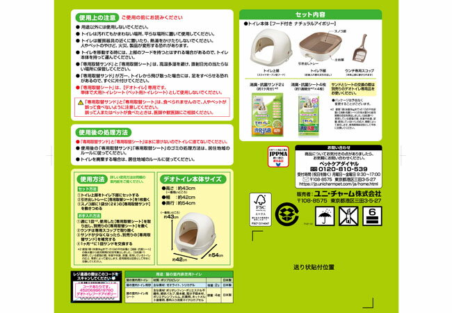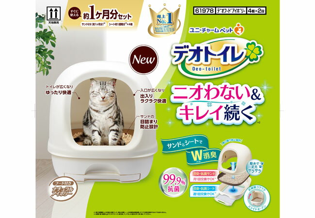 デオトイレ フード付き本体セット ナチュラルアイボリー ニオわない&キレイ続く!商品特徴■サンドとシートでW消臭!・シートは銀イオン配合。ニオイ菌99.9%抑制!1週間分のオシッコをパワフル吸収1・サンドとミクロの穴でニオイを吸着■撥水で足元サラサラ・足元にオシッコを残さない構造で、キレイな排泄スペースをキープ・消臭抗菌サンドは99.9%抗菌で清潔■お手入れ簡単!・シートは週1回、サンドは月1回の交換をするだけでOK・お手入れが簡単なのに、ゴミの量も51%削減・前後入れ替え可能で、同じ場所でオシッコするネコちゃんも無駄なく使える・お手入れしやすいスライドオープンフード■健康チェック・オシッコの色が確認しやすい白色シート・別売の「デオトイレ おうちでおしっこチェックキット」と組み合わせて体調管理できる■本体形状の改良!・壁の高さUP!サンドの飛び散り防止設計・排泄スペースが広くなり、ゆったり快適・新改良のスノコはサンドの目詰まり防止設計 メーカー名 ユニ・チャーム 株式会社 材質/素材【猫の室内用トイレ】ポリプロピレン【猫の室内トイレ用砂】ゼオライト、シリカゲル【猫の室内トイレ用シート】ポリオレフィン、ポリエステル不織布、綿状パルプ、吸水紙、高分子吸水材、ポリエチレンフィルム、抗菌剤、ホットメルト接着剤、香料入り消臭マイクロカプセル原産国または製造地日本商品使用時サイズ【デオトイレ本体サイズ】約 幅42×高さ43(一番高いところ)×奥行54cm使用方法・詳しい使用方法は同梱の案内紙をご覧ください。【セット方法】1、トイレ上部をトイレ下部にセットする。2、引き出しトレーに「専用取替シート」を1枚敷く3、スノコ部に1袋分(2L)の「専用取替サンド」を敷きつめるお手入れ方法1、週に1回((注)2)、使用した「専用取替シート」を取り出し、別売りの「専用取替シート」を敷く2、ウンチは専用スコップで取り除く3、サンドが少なくなったら、別売りの「専用取替サンド」を補充する4、1ヶ月((注)2)に1回サンドを交換する((注)2) 愛猫1頭(体重8kgまで)の1日の平均尿量と「消臭抗菌シート」の保水量から使用期間を目安に算出しました。(メーカー調べ)飼育している愛猫の数、体重や体調、尿量、使用しているトイレの広さ、季節によって変化します。使用期間は目安として早めに交換してください。諸注意■使用上の注意・用途以外には使用しないでください。・トイレは汚れてもかまわない場所、平らな場所に置いて使用してください。・トイレは暖房器具の近くに置いたり、熱湯をかけたりしないでください。人やペットのやけど、火災、製品が変形する恐れがあります。・トイレを移動する時には、上部のフードを持つとはずれる場合があるので、トイレ本体を持って運んでください。・「専用取替えサンド」と「専用取替シート」は、高温多湿を避け、直射日光の当たらない場所に保管してください。・「専用取替えサンド」が万一、トイレから飛び散った場合には、足をすべらせる恐れがあるので、すぐに片づけてください。・「専用取替シート」は、「デオトイレ」専用です。単体で犬用トイレシート(ペット用トイレシート)として使用しないでください。・「専用取替えサンド」と「専用取替シート」は、食べられませんので、人やペットが誤って食べないように注意してください。誤って人またはペットが食べたときは、医師や獣医師にご相談ください。※パッケージは予告なく変更することがございます。セット内容 ・トイレ本体・消臭抗菌サンド2L・消臭抗菌シート4枚重量 5.313kg 製品に関するお問い合わせは各メーカーへお願い致します。【ご 注 意】※納品後の交換は、ご注文品番以外のものが届いた場合を除き、交換・返品などはお受けいたしかねます。※メーカー在庫の為お急ぎの場合は、納期の確認をお願い致します。通常1週間〜10日(土・日・祝日を除く)で発送となります。(土日祝日は定休日の為、発送営業日に含まれませんのでご了承下さい。) ◆当社指定運送会社 送料無料(北海道・沖縄・離島を除く)にて発送いたします。※北海道は送料を300円頂きます。沖縄・離島は別途お見積もりをいたします。