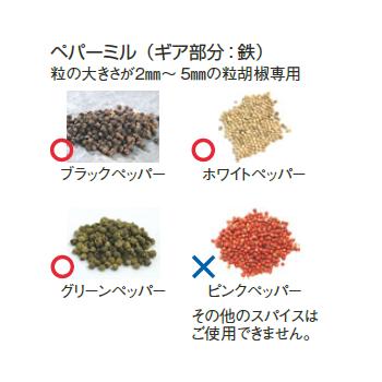 写真は同シリーズ商品です。サイズをお確かめの上、ご注文ください。 【外寸】φ56×H180mm ● 握り部の丸みが手になじむ美しいシェイプです。 ソルトミルはつまみ部分に「S」と印字されており、ペパーミルと区別しやすくなっています。 プジョーミルでご使用頂ける塩・胡椒 ペパーミル(ギア部分:鉄) 粒の大きさが2mm~ 5mmの粒胡椒専用