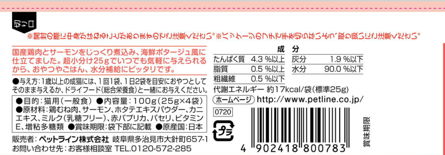 国産鶏肉とサーモンをじっくり煮込み、海鮮ポタージュ風に仕立てました。 超小分け25gでいつでも気軽に与えられるから、おやつやごはん、水分補給にぴったりです。 エネルギー:約17kcal/袋 賞味/使用期限(未開封):24ヶ月 材質/素材:日本 給与方法:1歳以上の成猫には、1回1袋、1日2袋を目安におやつとしてそのまま与えるか、ドライフード(総合栄養食)と一緒にお与えください。 原材料(成分):鶏むね肉、サーモン、ホタテエキスパウダー、カニエキス、ミルク(乳糖フリー)、赤パプリカ、パセリ、ビタミンE、増粘多糖類 保証成分:たんぱく質4.3%以上、脂質0.5%以上、粗繊維0.5%以下、灰分1.9%以下、水分90.0%以下 諸注意: ・この製品は猫専用です。他の動物には給与しないで下さい。 ・開封の際に中身がはねることがありますのでご注意下さい。 ・パッケージのフチで手を切らないよう、取り扱いにご注意下さい。
