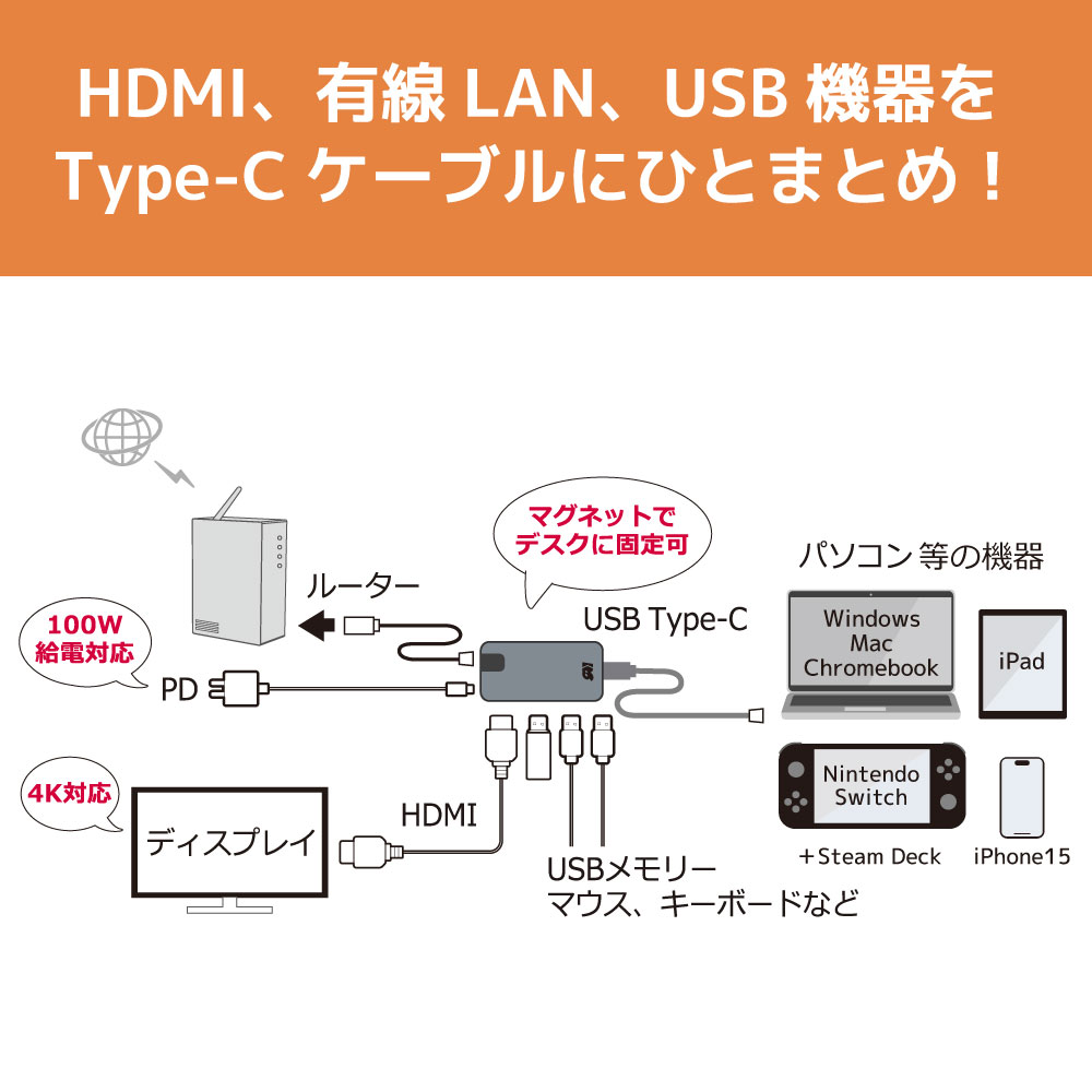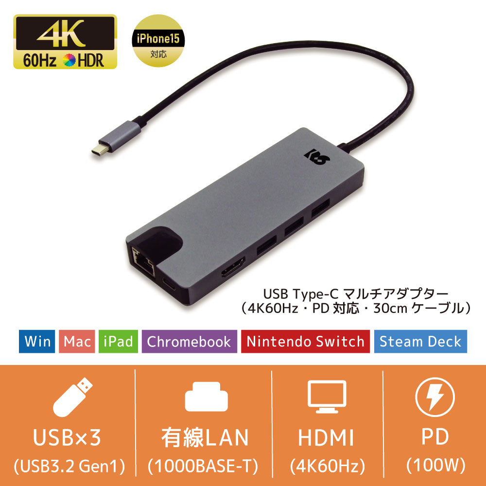 USB Type-C マルチアダプター(4K60Hz・PD対応・30cmケーブル) RS-UCHD-PHL4 製品特長: - USB Type-Aポートを3基搭載 - 高速ギガビット対応のLANポート搭載 - HDMIポート搭載 最大4K 60Hz、HDR対応であざやかな映像を楽しむ - ウルトラワイドモニターに対応 - 最大100WをサポートするPD 3.0対応ポート搭載 - Windows、Mac、Chromebook、iPad、iPhone15に対応 - Nintendo Switch、Steam Deckを快適にプレイ - ドライバーのインストール不要で簡単セットアップ - 配線しやすいロングケーブル