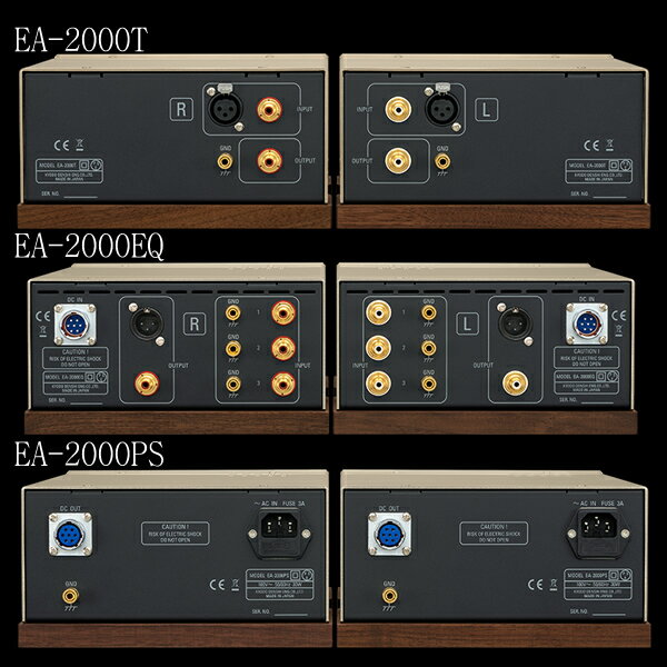 Phasemation EA-2000 2020年12月上旬発売商品 主な特長 Lch、Rch独立完全モノラル6筐体構成の管球式LCR無帰還型フォノアンプ EA-2000T T-2000をベースに特別チューニングを施したMC昇圧トランス部。 EA-2000EQ 自社巻きコイルを始め高音質部品にこだわった、新規設計の真空管式LCR型イコライザー部。 EA-2000PS EA-1000の電源部をベースに、更なるノイズ対策を施し、よりクリーンで強力になった電源部。 左右6筐体に分割され、強力な電源部に支えられた再生音は、高S/Nで高分解能、圧倒的な臨場感と見通しの良いステージ再現で演奏者の実在感を最高度に表現します。 モノブロック2筐体構成のMC昇圧トランス部 線材やコア材、巻線構造を見直し、高音質を追求したトランス。モノラル筐体構成にした堅牢な鋼鈑に銅メッキを施したシャーシベースと、誘導ハムシールドを配したケースカバー。さらに磁気シールド材を追加し2重構造とすることで左右での音質干渉を徹底的に排除することに成功したT-2000。 これをベースにEA-2000に特化したチューニングを施しました。 モノブロック2筐体構成の管球式ユニットアンプによる無帰還LCR型イコライザー部 1.過渡特性に優れ、音質に定評のあるECC-803Sの無帰還SRPP型増幅回路+6922(6DJ8の高信頼管)による超低インピーダンス出力カソードフォロワーをユニットアンプとして採用しました。真空管ならではのダイナミックレンジの大きな艶やかで躍動感ある音質をお楽しみいただけます。 2.イコライザー回路はLCR型を採用。信号系を低インピーダンス化できるLCR型とすることで、信号系での電力損失及び誘導ノイズを最小に抑え、音質劣化を抑制。自社巻きコイルや高音質フィルムコンデンサの採用等で昇圧トランスから得た情報をロスなく最終段の出力トランスより出力します。 3.3種類のイコライザーカーブ切り替えスイッチを搭載し、STEREO用RIAA、モノラル専用のMono1(DECCAレーベル等で使用)、Mono2(コロンビアレーベル等で使用)の選択が可能です。これによりDECCAレーベルもコロンビアレーベルもより高忠実度再生が可能となります。 モノブロック2筐体構成の直熱整流管5U4G、高容量Rコアトランスを使用した電源部 整流回路には必要以上に十分な容量を持つRコア電源トランスを使用し、原理的にスイッチングノイズの発生しない整流管5U4Gとチョークコイル2個並列使用による贅沢な整流回路を左右独立電源それぞれに採用しています。 さらに電源トランス、チョークコイルに磁気シールド対策を施し、よりクリーンで強力な電源をアンプ部に供給しています。 また、アンプ部のヒーター電源には3端子レギュレータによるDC点火を採用し、高S/Nを実現しました。 質感の確保 アルミ削り出しの操作ツマミ、20mm厚アルミスラントフロントパネル、2mm厚銅メッキ鋼板シャーシベース、2mm厚アルミ材に磁気シールドを配したカバーで構成された、強靭な筐体構造採用により剛性確保と磁気歪低減を実現しています。 シャーシ底面にはウォルナット単板を配し、金属シャーシの不要共振を効果的に抑え込みます。 フットには外部振動を遮断するTAOC製ハイカーボンインシュレーターを採用。 RCA端子は高品質・高音質で定評のあるWBT社製を採用し、XLR端子には音質のトータルバランスを追求し、フルテック製ロジウムメッキ端子を採用しました。 普遍性の高い風格のある仕上がりは、所有する喜びを裏切りません。 製品仕様 形式:管球式LCR型無帰還フォノアンプ 入力様式:MM:MC 入力感度:2mV:0.1mV 適合カートリッジ出力インピーダンス:47kΩ以下:1.5~40Ω 利得:40dB:66dB 入力換算S/N比:-120dBV:-140dBV 定格出力電圧:200mV(1kHz) リアカーブ偏差:±0.5dB(20~20kHz) 消費電力:35W(100VAC 50~60Hz)/片ch 外形寸法:トランス部:214(幅)×118(高さ)×265(奥行)×2 アンプ部:214(幅)×118(高さ)×368(奥行)×2 電源部:214(幅)×118(高さ)×352(奥行)×2 本体質量:トランス部4.5kg、アンプ部6.1kg、電源部7.8kg / x2 ※ご注意 EA-2000Tの入力は、XLRとRCAのどちらか片方しか使用できません。両方に同時に接続すると誤動作の原因になります。