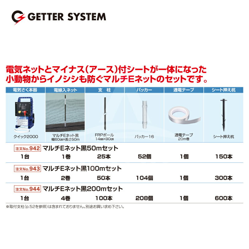●末松電子の電柵セット。イノシシ・ハクビシン・アライグマ向け ●電気ネット式とマイナス(アース)付シートが一体になったセットです。 ●本機をご購入後、お客様登録をされますと最長一年間の盗難補償が付いています。また、万一、正常な使用法のもとで故障した場合は3年間修理無料保証付きです。 ・製品コード 943 <セット内容> ・本 体:クイック2000 電源:DC12V(ゲッターアルカリ電池12V内臓) 最大電線長:2000m ・マルチEネット黒(幅60cm×長さ50m)[2巻] ・FRPポール(14mm×90cm)[50本] ・パッカー16[104個] ・通電テープ20m巻[1個] ・シート押え杭[300本] ※北海道・沖縄・離島は別途送料がかかります。 ※季節商品のため、在庫切れ及びお届けまでお時間いただく場合がございます。お急ぎの場合は在庫確認等お問い合わせください。