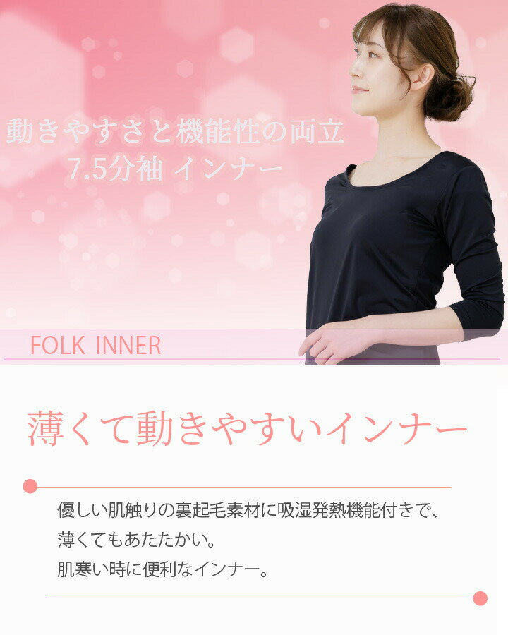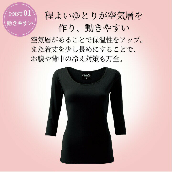 FOLK インナー レディース レディースカットソー(7.5分袖) オールシーズン着られるインナー ●機能:ストレッチ、吸汗速乾 ●素材:スクラピングベア天 ●混率:ポリエステル88%、ポリウレタン12%