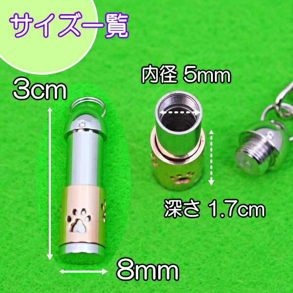 商品名 遺骨入れカプセル サイズ ●本体サイズ: シリンダー部分 約縦3cm 内径5mm 深さ1.7cm 各色柄の袋付き 素材 ●本体素材: ステンレス ◆商品の在庫がない場合はご連絡させて いただきます。