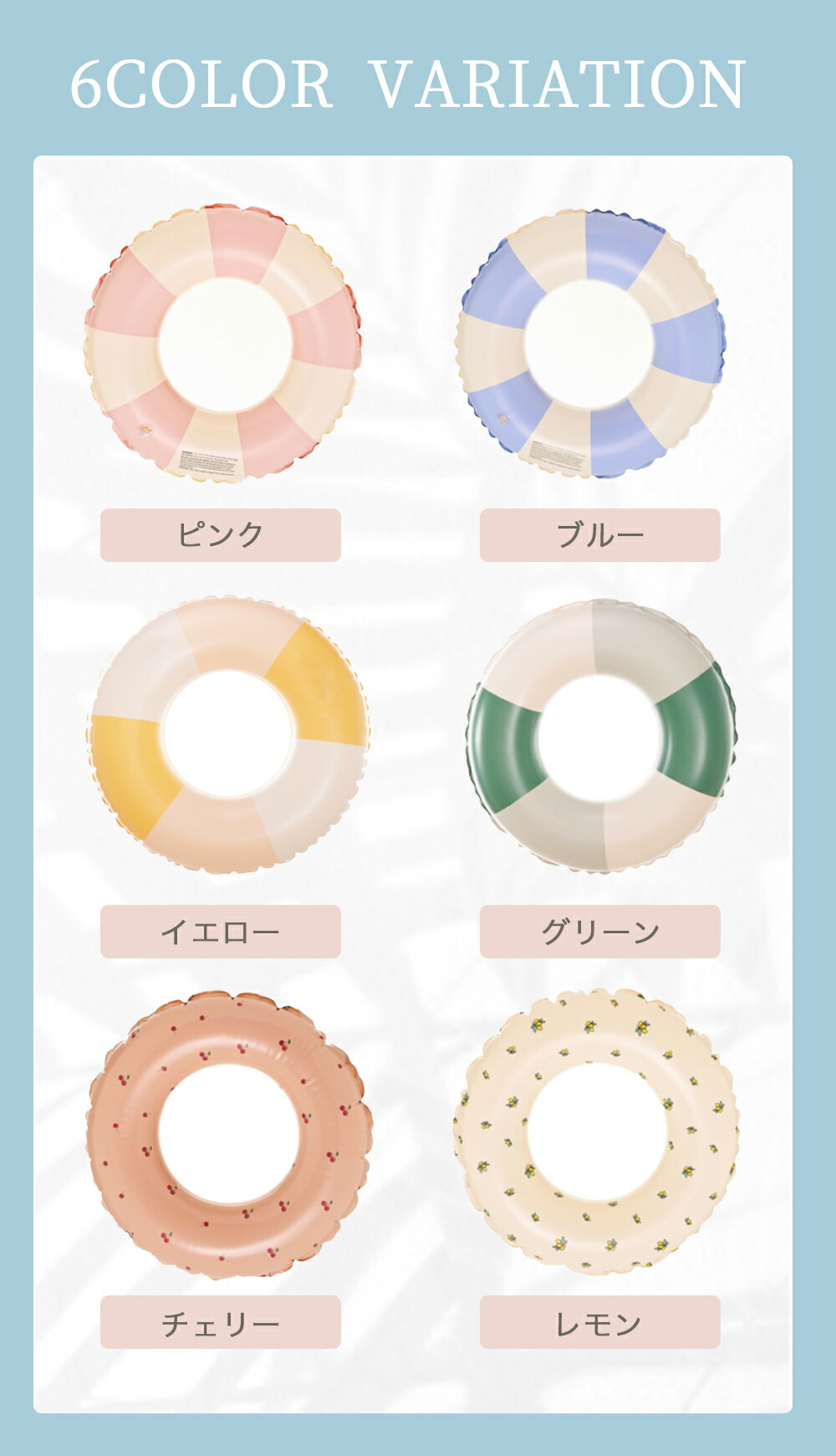 子供 浮き輪 レトロ 子供用 大人用 浮輪 かわいい 男の子 女の子 海 プール 夏休み おもちゃ 水泳 うきわ ブルー ピンク グリーン チェリー れもん シンプル リング型 アウトドア ビーチグッズ 夏 水遊び 海水浴 商品名 パステルカラー レトロ浮き輪 カラー =ストライプタイプ= ピンクブルーイエローグリーン =フルーツ柄タイプ= チェリーレモン サイズ 【50cm】外寸:42cm 内寸:20cm 参考年齢:2歳 【60cm】外寸:50cm 内寸:22cm 参考年齢:2歳-4歳 【70cm】外寸:58cm 内寸:26cm 参考年齢:5歳-9歳 【80cm】外寸:66cm 内寸:30cm 参考年齢:10歳-15歳 【90cm】外寸:75cm 内寸:35cm 参考年齢:16歳-18歳 素材 PVC素材 商品説明 【レトロな柄が可愛いパステルうきわ】 ビーチやプールで今年の夏大活躍すること間違いなし! パステルのストライプ柄と、可愛いフルーツの柄の浮き輪です。 キッズから大人まで幅広い年齢の方に使っていただけるサイズをご用意しました! パステルストライプのおしゃれな浮き輪は、男の子も女の子も使える、柔らかい色味です。お友達同士お揃いはもちろん、親子でもお揃いにできるカラーなので、お写真映えも可愛さUP! 注意事項 商品のお色は、ご使用のモニター・照明の関係で実物と多少の違いが生じることがございます。ご了承ください。 初期不良の場合のみ14日間保証が適用されます。状況により、適用外になる場合がございますので予めご了承ください。 入荷時期により予告なく製品のデザインや形に多少変更がございます。ご了承ください。 遊具となり、救命用ではございませんので、お子様が使用する際は必ず保護者同伴の元、お子様からお目を離さないようにお願い致します。 こちらの商品の使用中の事故に関しては一切の責任を負えませんので、何卒ご了承の上ご注文をお願い致します。 こんなシーンでおすすめです 海 旅行 ピクニック プール 海岸 ビーチ 川 庭 夏休み キャンプ グランピング バーベキュー こんな方におすすめです ユニセックスで使える浮き輪を探している。 シンプルでおしゃれな浮き輪を探している。 大きさが選べる浮き輪を探している。 子供用のサイズがある浮き輪を探している。 【関連キーワード(本商品の説明ではありません)】 子供 浮き輪 レトロ 子供用 大人用 浮輪 かわいい 男の子 女の子 海 プール 夏休み おもちゃ 水泳 うきわ ブルー ピンク グリーン チェリー れもん シンプル リング型 アウトドア ビーチグッズ 夏 水遊び 海水浴PICUP EVENT CATEGORY HOT ITEM