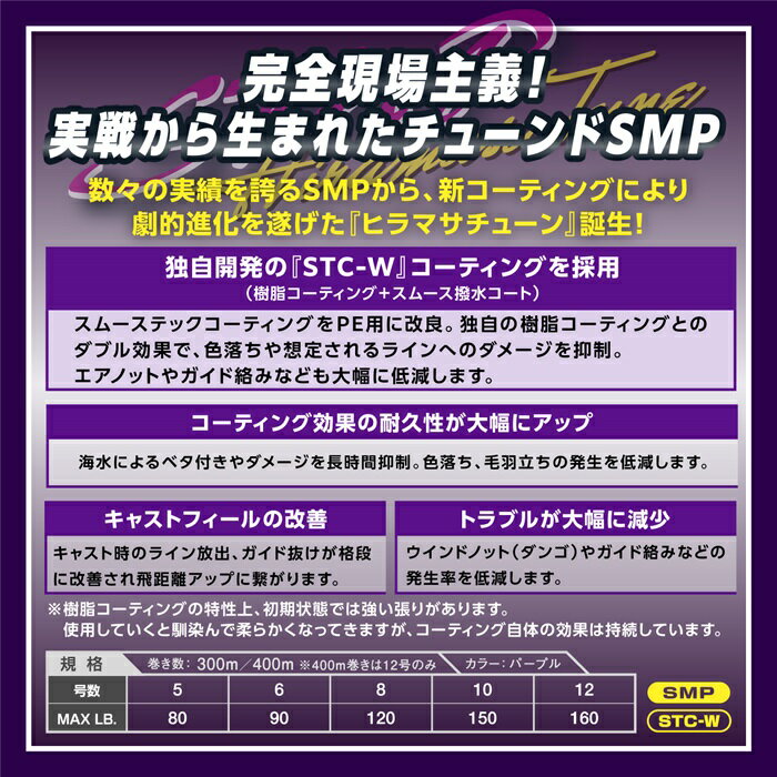 キャスティングPE SMP ヒラマサチューン 300m パープル 【在庫あり・即納 】 バリバス アバニ 6号 8号 PEライン マックスパワー smp キャスティング マグロ キハダ ヒラマサ GT パープルPE 300m巻きサイズ(号) -MAX(lb)6号- 90lb8号- 120lb完全現場主義!実戦から生まれたチューンドSMP独自開発の『STC-W』コーティングを採用スムーステックコーティングをPE用に改良。独自の樹脂コーティングとのダブル効果で、色落ちや想定されるラインへのダメージを抑制。エアノットやガイド絡みなども大幅に低減します。コーティング効果の耐久性が大幅にアップ海水によるベタ付きやダメージを長時間抑制。色落ち、毛羽立ちの発生を低減します。キャストフィールの改善キャスト時のライン放出、ガイド抜けが格段に改善され飛距離アップに繋がります。トラブルが大幅に減少ウインドノット(ダンゴ)やガイド絡みなどの発生率を低減します。※初期状態では、多少のゴワゴワ感がありますが製品特徴によるものですので、問題はございません。(注)宅急便コンパクトで発送させていただく場合があります。 2