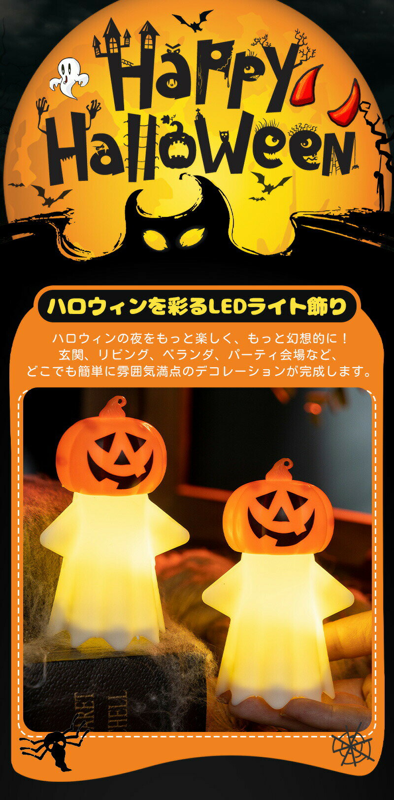 【商品説明】サイズ(単位:cm) 7*5.5*11cm カラー写真通り(写真※ご参考程度)素材プラスチック、その他光源LED電源供給ボタン電池商品内容2個セット商品紹介 【ハロウィンを彩るLEDライト飾り】 ハロウィンの夜をもっと楽しく、もっと幻想的に! かぼちゃ、ゴースト、コウモリなどのモチーフが可愛く光るLED装飾ライトです。 玄関、リビング、ベランダ、パーティ会場など、どこでも簡単に雰囲気満点のデコレーションが完成します。 【電池式でコードレス】 電源コード不要の電池式デザイン。コンセントがない場所でも手軽に設置可能! パーティやイベントに持ち運んで使えるのも嬉しいポイントです。 配送方法佐川急便(日時指定可・代金引換決済不可)送料 ご注意事項◆ 商品写真はできる限り実物の色に近づけるよう加工しておりますが、お客様のお使いのモニター設定、お部屋の照明等により実際の商品と色味が異なる場合がございます。 ◆ 平置き計測となっておりますので、2・3cmの誤差が生じる場合がございます。 ◆ プリント生地の商品については、生地の裁断・縫製方法により写真と同様の柄が出ない場合がございます。◆ 色落ちの恐れがありますので、他のものと一緒に洗濯をしないで下さい。単品手洗いでお願いいたします。◆ 楽天から届く自動配信メールは【送料】や【割引】等が正しく計算されない場合があります。 後ほど当店からのメールにて改めて正しい合計金額をご連絡致します。 返品対応 返品・交換は原則としてお受けしておりません。 初期不良や弊社都合による著しい発送遅延などが発生した場合は、未使用の商品のみ到着日から7日以内にご連絡頂ければご返金・交換対応させて頂きます。 明細書・領収書※当店では紙資源保護の観点から、納品書・領収書は商品と同封しておりません。 ※必要な際は備考欄に記載をお願いします。? ※(領収書の宛名など必要事項を合わせてご記入しご連絡ください)。 ※予めご了承くださいませ。