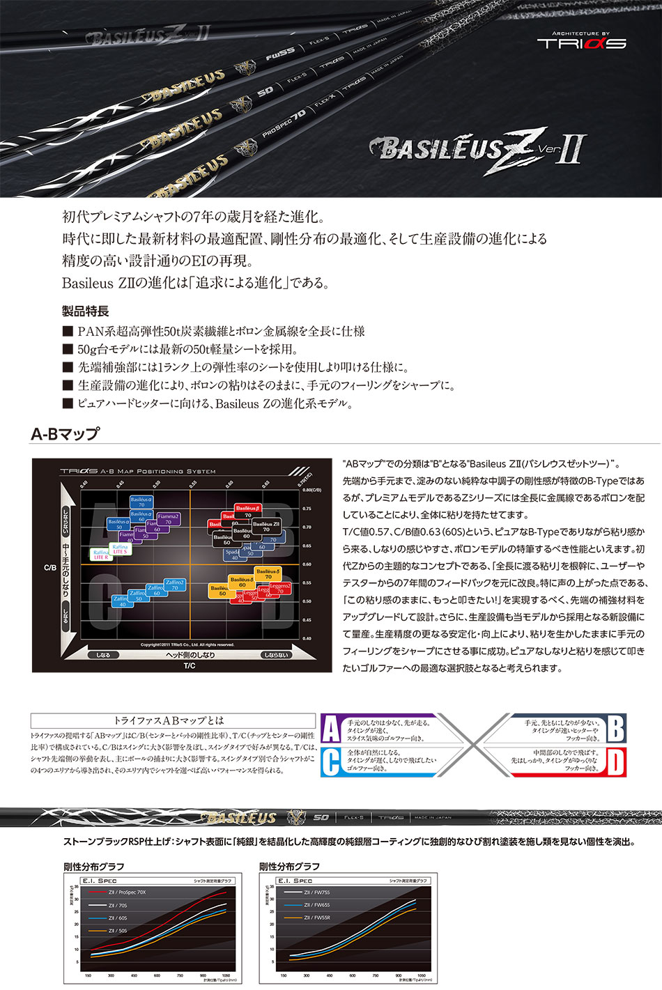 SRIXON スリクソン 2024 Zxi スリーブ付シャフト Basileus Z2 バシレウス ゼット2 ドライバー用商品詳細Basileus Z2(バシレウス ゼット2)は、ゴルファーの力と意思を具現化するために設計されたドライバー用シャフトです。初代Basileus Zの圧倒的なコントロール性能と飛距離性能をさらに高め、ユーザーとテスターからのフィードバックを忠実に取り入れて進化を遂げました。 このシャフトの最大の特徴は、全長にわたって配されたボロン金属線です。これにより、シャフト全体に粘りが生まれ、スイング時のしなり感を感じやすくしています。B-Typeの中調子の剛性感と相まって、プレイヤーは一貫したスイングと優れたコントロール性能を体感できます。特に、T/C値0.57、C/B値0.63(60S)というバランスが、理想的な打球を可能にします。 先端補強部には、初代Zシリーズよりも高い弾性率のシートを採用し、より叩ける仕様にアップグレードしました。これにより、ヘッドスピードの向上と飛距離の最大化を図ることができます。さらに、生産設備の進化により、ボロンの粘りを保持しつつ、手元のフィーリングをシャープにすることに成功しました。 PAN系超高弾性50t炭素繊維を使用し、50g台の軽量モデルには最新の50t軽量シートを採用。これにより、軽量化と強度の両立を実現し、より多くのゴルファーに対応します。 Basileus Z2は、ピュアなしなりと粘りを感じながら、シャフト全体で力を伝えることができる、ハードヒッターに最適なシャフトです。ゴルファーの理想を形にするための最高の武器として、Basileus Z2をお試しください。 <ポイント> Basileus Z2 バシレウス ゼット2 ドライバー用シャフト ゴルフシャフト 高弾性炭素繊維 ボロン金属線 中調子シャフト ハードヒッター向け ゴルフ飛距離アップ コントロール性能向上 ※在庫について当サイトに掲載されている在庫は店頭在庫と連動しております。必ずしもリアルタイムの在庫状況ではございません。在庫がなかった場合は、メールにてお知らせいたします。メーカー取り寄せ品、生産終了、在庫終了等の際、ご注文をキャンセルさせていただく場合がございます。予めご了承くださいませ。付属の固定ネジに関して当店では、スリーブの先端にヘッドを固定するネジを予備でお付けしております。必ず取り外してから装着してください。尚、この付属品は、サービスの一環として提供させていただいております。※ヘッドモデルによってはネジ仕様に違いがあり固定できない場合がございます。あらかじめご了承ください。ご購入にあたっての注意事項(必ずご確認下さいませ)弊店ではすべてのお客様に安定した品質をご提供するため、信頼されるサービスを提供いたします。長さ当店の長さ測定基準は60°法を用いて選択いただいたヘッドを装着した状態で、シャフトエンドまでとなります。お持ちのクラブと当店の長さ測定基準の図解を併せてご確認いただき、ご指定ください。なお、シャフト単体やスリーブ先端からグリップエンドまでの測定は行っておりません。シャフト・構えた時に見えないよう、シャフトロゴの向きは「下向き」に組み上げております。別途指定がある場合は、備考欄に記載下さい。・選択いただいた装着ポジションにおいて「シャフトロゴは裏側(構えた時見えない)」を基準としております。・バランス調整、振動数の計測は行っておりません。スリーブ・スリーブは非純正品となりますが、問題なくご使用いただけます。・スリーブの先端には、ヘッドを固定するネジを予備でお付けしております。取り外してから装着して下さい。尚、この付属品は、サービスの一環として提供しております。ヘッドモデルによってはネジ仕様に違いがあり装着出来ない場合がございます。グリップ・標準装着のゴルフプライド、IOMIC、タッキーマークとの差額値引きは行っておりません。・標準で装着しているIOMICとタッキーマークグリップは、「グリップロゴ裏刺し(構えたときに見えない)」を基準としています。・グリップの変更を希望される場合は、デフォルト設定から『変更する』を選択し、別途販売ページでグリップ単体を購入してください。備考欄への記載はご遠慮ください。・グリップ変更でバックライン有のグリップ、またはバックライン無のグリップは、次の基準で統一しております:バックライン有:グリップロゴ表バックライン無:グリップロゴ裏※別途ご希望がある場合は、備考欄にご記載ください。・グリップ変更でバックライン有を希望された場合、グリップロゴの位置がヘッドの個体差によりフェースが被って見えるまたは、開いて見える場合がございます。ご理解の上、ご注文ください。・グリップ下巻きに関しまして下巻 割増 110円https://item.rakuten.co.jp/banzaigolf/repair-00008/標準1重+2重=3重まで可能です。2重の場合は、1点3重の場合は、2点お買い求めください。当店は螺旋巻きが基準です。納期・完全受注生産のため、当店にて御注文確定後、土日祝