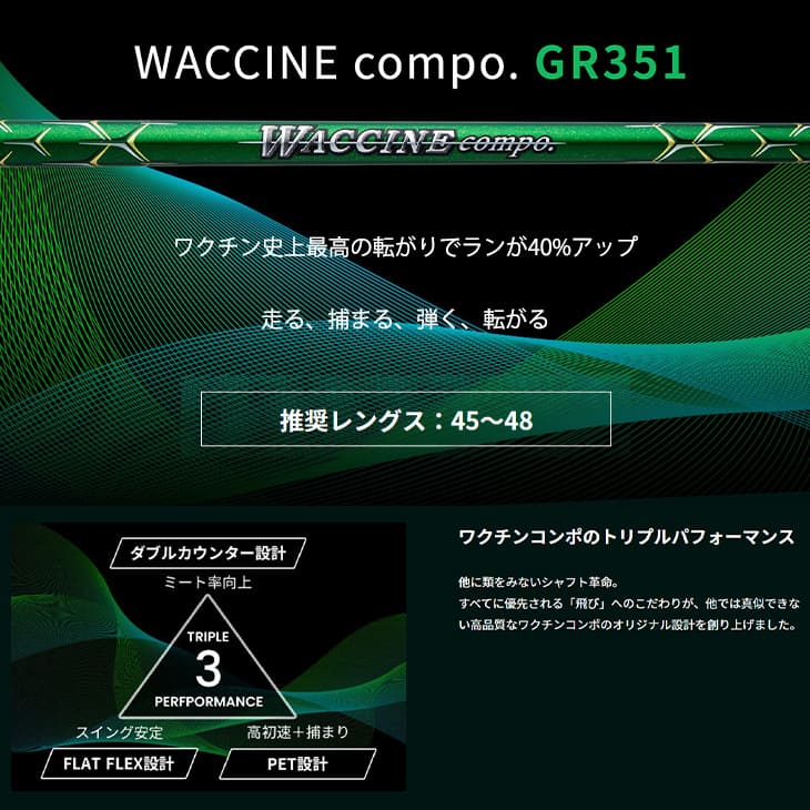 SRIXON スリクソン 2024 Zxi スリーブ付シャフト GRAVITY グラビティー WACCINE compo ワクチンコンポ GR351 DR ドライバー用商品詳細ワクチン コンポ GR351 ドライバー用シャフトは、ゴルフのパフォーマンスを劇的に向上させるために設計された革新的なシャフトです。このシャフトは、ワクチン史上最高の転がりを実現し、ランが40%アップすることで、飛距離を大幅に向上させます。 GR351の特長は、その独自の重量配分にあります。シャフトの先端と手元に金属を絶妙に配合することで、軽いものを重く、重いものを軽く感じさせることができます。この設計により、ゴルファーは振りやすさとミート率を向上させ、スイングの一貫性を保つことができます。また、重いものを軽く感じることで、ヘッドスピードを高めることが可能となり、さらなる飛距離アップが期待できます。 さらに、GR351は「FLAT FLEX設計」を採用しており、ドライバーからサンドウェッジまでのすべてのクラブで同じ振動数を保つことができます。これにより、番手ごとにスイング感が変わることなく、安定したショットが実現します。この一貫性が、ショットの正確性とスコアアップにつながります。 ワクチン コンポ GR351 ドライバー用シャフトは、ゴルファーのタイプに合わせた最適な重量配分を実現し、従来のゴルフクラブでは得られなかった新しいアプローチを提供します。 <スペック> GR351 DR フレックス R: 重量 42g, トルク 7, キックポイント 超先, 長さ 46インチ, チップ径 .335 フレックス SR: 重量 45g, トルク 6.5, キックポイント 超先, 長さ 46インチ, チップ径 .335 フレックス S: 重量 49g, トルク 6, キックポイント 超先, 長さ 46インチ, チップ径 .335 フレックス SX: 重量 52g, トルク 6, キックポイント 超先, 長さ 46インチ, チップ径 .335 <ポイント> ワクチン コンポ GR351 ドライバー用シャフト ゴルフシャフト 飛距離アップ FLAT FLEX設計 ミート率向上 ヘッドスピードアップ 重量配分シャフト ゴルフクラブ一貫性 ※在庫について当サイトに掲載されている在庫は店頭在庫と連動しております。必ずしもリアルタイムの在庫状況ではございません。在庫がなかった場合は、メールにてお知らせいたします。メーカー取り寄せ品、生産終了、在庫終了等の際、ご注文をキャンセルさせていただく場合がございます。予めご了承くださいませ。付属の固定ネジに関して当店では、スリーブの先端にヘッドを固定するネジを予備でお付けしております。必ず取り外してから装着してください。尚、この付属品は、サービスの一環として提供させていただいております。※ヘッドモデルによってはネジ仕様に違いがあり固定できない場合がございます。あらかじめご了承ください。ご購入にあたっての注意事項(必ずご確認下さいませ)弊店ではすべてのお客様に安定した品質をご提供するため、信頼されるサービスを提供いたします。長さ当店の長さ測定基準は60°法を用いて選択いただいたヘッドを装着した状態で、シャフトエンドまでとなります。お持ちのクラブと当店の長さ測定基準の図解を併せてご確認いただき、ご指定ください。なお、シャフト単体やスリーブ先端からグリップエンドまでの測定は行っておりません。シャフト・構えた時に見えないよう、シャフトロゴの向きは「下向き」に組み上げております。別途指定がある場合は、備考欄に記載下さい。・選択いただいた装着ポジションにおいて「シャフトロゴは裏側(構えた時見えない)」を基準としております。・バランス調整、振動数の計測は行っておりません。スリーブ・スリーブは非純正品となりますが、問題なくご使用いただけます。・スリーブの先端には、ヘッドを固定するネジを予備でお付けしております。取り外してから装着して下さい。尚、この付属品は、サービスの一環として提供しております。ヘッドモデルによってはネジ仕様に違いがあり装着出来ない場合がございます。グリップ・標準装着のゴルフプライド、IOMIC、タッキーマークとの差額値引きは行っておりません。・標準で装着しているIOMICとタッキーマークグリップは、「グリップロゴ裏刺し(構えたときに見えない)」を基準としています。・グリップの変更を希望される場合は、デフォルト設定から『変更する』を選択し、別途販売ページでグリップ単体を購入してください。備考欄への記載はご遠慮ください。・グリップ変更でバックライン有のグリップ、またはバックライン無のグリップは、次の基準で統一しております:バックライン有:グリップロゴ表バックライン無:グリップロゴ裏※別途ご希望がある場合は、備考欄にご記載ください。・グリップ変更でバックライン有を希望された場合、グリップロゴの位置がヘッドの個体差によりフェースが被って見えるまたは、開いて見える場合がございます。ご理解の上、ご注文ください。・グリップ下巻きに関しまして下巻 割増 110円https://item.rakuten.co.jp/banzaigolf/repair-00008/標準1重+2重=3重まで