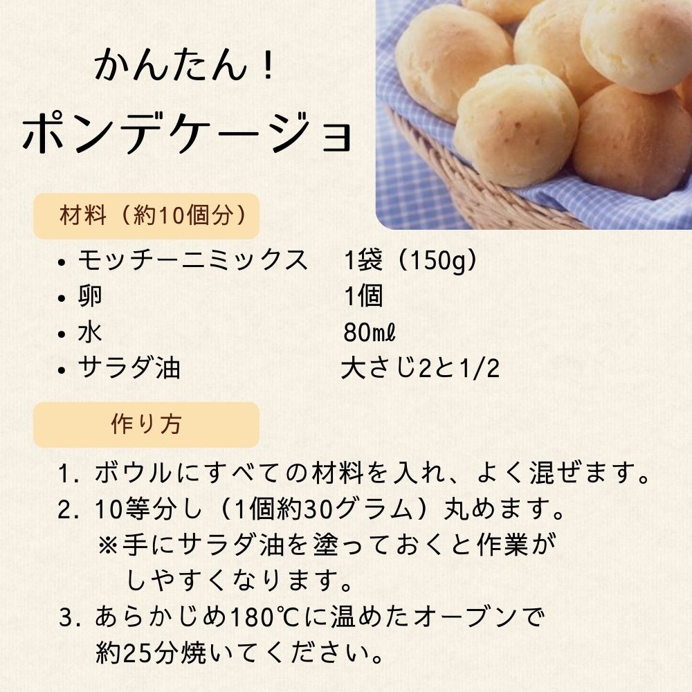 【家庭用プレミックス粉】です。 【特徴】 もちもちした食感でおなじみのブラジルのチーズパンを 手軽にご家庭で作れます。 アレンジが簡単でピザやたこ焼きでもちもちとした食感をお作りいただけます。 150gパック×4袋入りで、面倒な計量がいりません。 ケース販売はこちら↓ 商品説明名称ポン・デ・ケージョ用ミックス粉 原材料小麦粉(国内製造)、ショートニング、食塩、乳等を主要原料とする食品、ぶどう糖/加工でん粉、膨張剤、カゼインナトリウム、香料、(一部に小麦、乳成分を含む) 内容量600g × 15袋入り (9kg) 包装ポリ(内装)、段ボール(外装) 賞味期限製造日より12か月 保存方法高温、多湿、直射日光をさけ、常温で保存してください。 開封後は、虫害による健康被害を防ぐため、袋口を輪ゴムなどでしっかり閉じて冷蔵庫に保存し、お早めにお使い下さい。 吸湿、においの吸着を防ぐため、密閉容器にいれることをおすすめします。製造者 熊本製粉株式会社 熊本市西区花園1丁目25番1号 製造所 熊本製粉株式会社福岡工場 福岡市東区箱崎ふ頭6丁目8番23号 リニューアルに伴い、パッケージ・内容等予告なく変更する場合がございます。予めご了承ください。ネットショップで販売して欲しいとのお問合せNo1商品です!