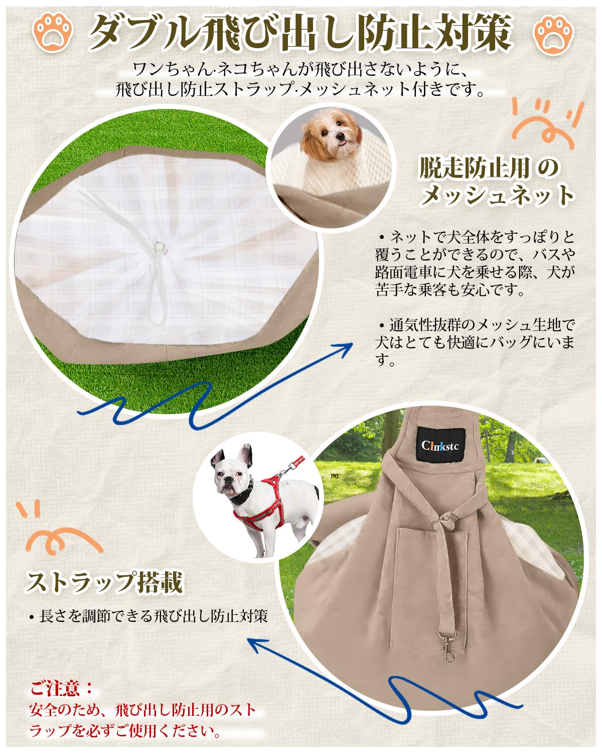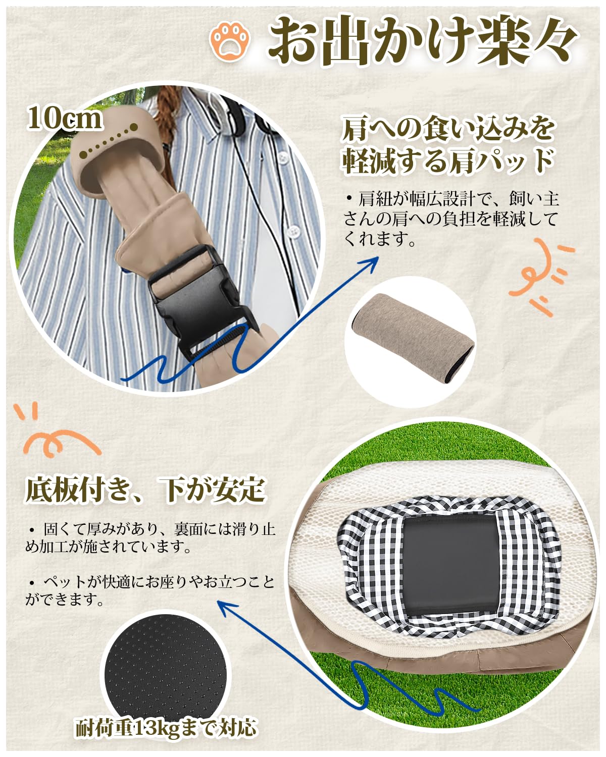 商品情報商品の説明主な仕様 【実用的なバッグ底板と肩パッド付き】底板は、耐久性のある素材で作られており、ペットの重量を十分に支える硬度を持ち、変形や破損することはありません。ペットが快適に過ごせるだけでなく、より安定した状態で座ることができますよ!デザインと機能性に徹底的にこだわっていた肩パッドは、長時間の持ち運びによる肩の負担を軽減することや長さ調節用のバックルが当たる場合などの問題を解決します。br【2つの飛び出し防止仕様】ペットスリングに飛び出し防止用のナスカンとメッシュネットがついています。猫と犬が首輪をつけるの場合、ナスカンを首輪につけて、ペットを保護すると同時に活動のニーズにも応えることができます。スリング内部は通気性の良い飛び出し防止用メッシュネットが付いており、快適性と安全性を両立させています。br【調節機能付きワンタッチバックル】肩ひもの長さは調節できますので、使用する飼い主さんの体形に合わせることが可能です。肩掛け部分の幅は10cmと広めです。愛犬を入れたときに重さを感じにくく、安定感がある作りとなっています。br【優しいコットン生地】外側は綿生地、内側はポリエステル生地で耐久性のある2重縫製が施され、毛が付きにくく、いつも清潔しやすく、ペットの健康を守ります。通気性も良くて、変な匂いもなくて、愛犬や愛猫がきっと気に入ります。全体に丸洗い可能で、汚れてもらくらくとお手入れできます。br【耐重量13kg・保証】スリングは13kgまでの猫、犬、小型ペットに対応可能です。お買い上げ日より 30日以内であれば、万一不具合などががございましたら、返品・交換で対応させていただきます。商品にご質問がございましたら、いつでもご連絡いただけ、24時間以内にできるだけ早くお返事いたします。