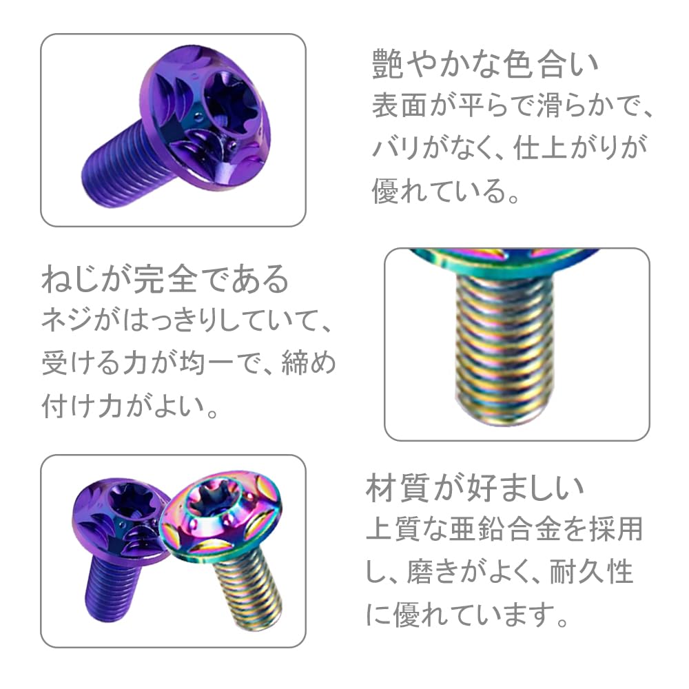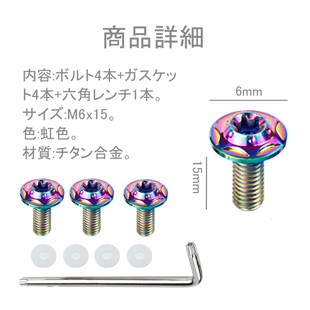 商品情報商品の説明【セット内容】:ボルト×4個、ガスケット×4個、サイズ:M6x15、色:虹色/ブルー。主な仕様 【セット内容】:ボルト×4個、ガスケット×4個、サイズ:M6x15、色:虹色/ブルー。br【良質な材質】:ボルトに良質なチタン合金を採用し、チタン合金ねじは軽量で強度が高く、硬度が大きく、腐食や錆に強い特性がある。br【耐久性】耐久性に優れ、チタン合金ボルトは水、泥、油、酸、アルカリなどの条件下で、良好な耐食属性を有する。 特に頑丈なボルトは、日常の運転や過酷な道路状況でも安定し、簡単に外れることはありません。br【デザインが美しい】色が豊富で美しく、色が明るくて質感があり、好みや車両の外観に合わせてどこにでも取り付けられます。br【多目的】簡単な操作で車両に取り付けることができ、美しくて盗難防止にも効果的で、他の装飾品や部品を固定して自分でDIYすることもできます。