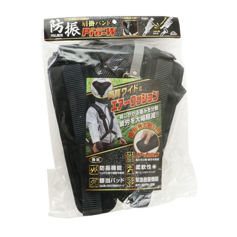 商品情報説明草刈り作業時の振動や草刈り機本体の重量負担を大幅削減します。用途草刈作業用。機能パット部は立体エアークッションが肩にしっかりフィットし肩へかかる負担を軽減します。パットはマジックテープで着脱可能で、汚れたときは取り外し汚れを取り除くことができます(洗濯は不可)。緊急脱着機能付き、ゴム部分を引くことで即座に刈払機を身体から離すことができます。引き抜く部分を溝付きのゴムにすることでグリップ性が上がり、引き抜きやすさもプラスチック製に比べアップします。両肩ワイドパットで負担を分散し疲労を更に軽減します。仕様●エアークッションパット。材質等●ポリエステル・鉄。付属品・部品など注意・ご案内【ご注意(免責事項)> 必ずお読み下さい】商品情報には注意を払っておりますが、メーカー都合により予告なくパッケージ、商品名、容量、産地等が変更になる場合がございます。予めご了承ください。