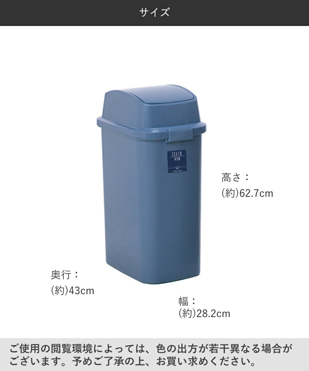 【商品について】 中身が見えないスイング蓋タイプ。市販の45L用ポリ袋が使用できます。製品重量の60%再生素材使用。■規格サイズ:蓋込み(約)幅28.2×奥行43×高さ62.7cm本体のみ(約)幅28.2×奥行40.9×高さ50.5cm 容量:(約)42L重量:(約)1.8kg■材質ポリプロピレン(再生樹脂)■ご使用にあたっての注意事項・ご使用上の注意を必ずお読みいただき、正しくお使いください。 ・閲覧環境によっては色の出方が異なる場合がございます。