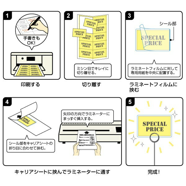 型抜きされたラミネートフィルムと、ミシン目で切り離せる用紙がセットになった、POP作成キットです。専用の厚口用紙に印刷して、フィルムに挟んでラミネートするだけでオリジナルのPOPが簡単に作成できます。はさみやカッターが不要なので、手軽に作れて、仕上がりもキレイです。工作物やハンドクラフト、イベントやパーティーの飾りつけなどにもオススメです。※フィルムづまりを防止するキャリアシート付き。