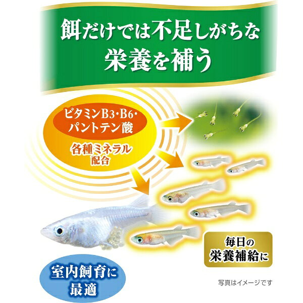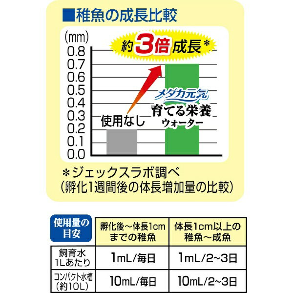 メダカは太陽光を浴びることで成長に必要なビタミンの一部を体内で合成します。本製品は、餌からは摂取しにくく、室内飼育や日照不足で十分な太陽光を浴びることのできないメダカに不足しがちなビタミンB3・B6・パントテン酸と各種ミネラル類を配合した、成長用栄養ウォーターです。未使用時と比較して約3倍成長(メーカー調べ)!●成分:塩化ナトリウム、塩化カリウム、パントテン酸、ビタミンB6、ナイアシン(B3)●使用環境:淡水