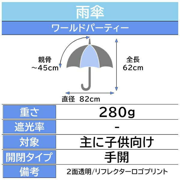 子ども用レイングッズで雨の日のスクール通いやお出かけを楽しく安全性に配慮したデザインを採用し、女の子にも男の子にも似合うかわいい柄が充実。身長に合わせて2サイズ展開からお選びいただけます。お気に入りのレイングッズを見つけて、雨の日を楽しく過ごしましょう。■ 2コマ透明で視界が良好傘にすっぽり隠れても、2コマある透明窓から前後の視界をしっかりと確保。ロゴプリント部分はリフレクター(反射材)付き。■ 簡単に開閉できるノンハジキタイプ親骨に軽くて丈夫なグラスファイバーを使用。■ 丸みのある形のパーツ安全にご使用いただけるよう、先端パーツ(つゆ先・石づき)は丸みのある形。手元は手触りの良いマットな質感。■ マジックテープのバンド小さなお子様も簡単に留め外しが可能。■ おなまえネーム付き傘の内側に、名前を書けるネーム付き。