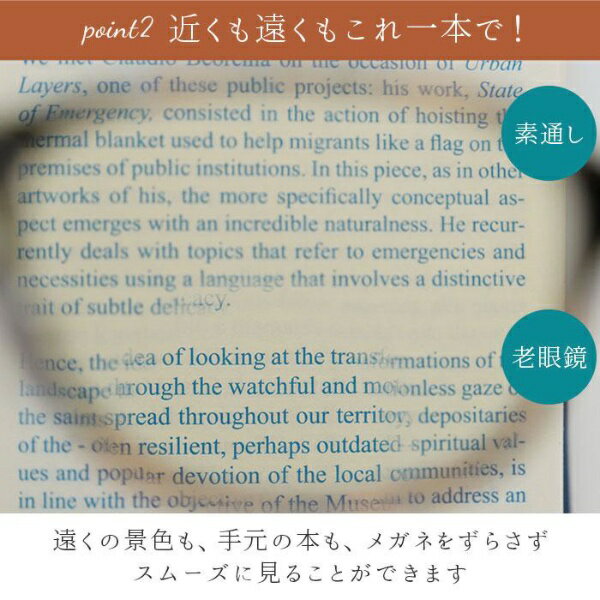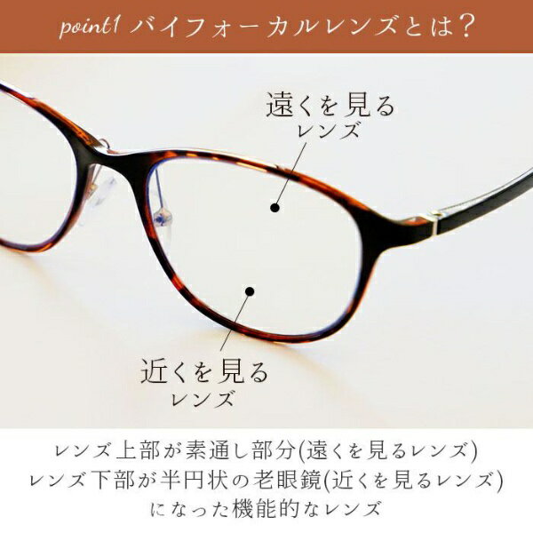 ■近くも遠くもこれ一本で!■お洒落なデザインで素敵に掛けられる「バイフォーカルグラス遠近両用老眼鏡」。■遠くを見るレンズと近くを見るレンズを組み合わせた「バイフォーカルレンズ」を採用し、遠くの景色も近くの本もメガネをずらさずにスムーズに見ることができる遠近両用シニアグラス。■バイフォーカルレンズとは、レンズ上部が素通し部分(遠くを見るレンズ)、レンズ下部が半円状の老眼鏡(近くを見るレンズ)になった機能的なレンズ。■レンズの境目が分かりづらく、パッと見はお洒落なファッショングラス。■お仕事で長時間パソコン作業をされる方や、空き時間についついスマホを眺めてしまう方でも安心なブルーライトカット機能付き。■度数は「+1.0」「+2.0」「+3.0」「+4.0」の選べる4タイプ。■フレームのデザインも、フルリムタイプ、ハーフリムタイプ、リムレスタイプなど、知的な雰囲気のものから、女性らしい繊細なデザインまでバリエーション豊富。■読書をしながらテレビも見たい時、手元でパソコン作業をしながら商談をする時など、プライベートからオフィスまで大活躍のシニアグラス。【主な仕様】・サイズ: 【P159-B.デミ】[レンズ横幅] 約49mm [レンズ縦幅] 約38mm [鼻幅] 約10mm [フレーム幅] 約135mm [テンプル] 約140mm 【F161-B.ゴールド】[レンズ横幅] 約54mm [レンズ縦幅] 約38mm [鼻幅] 約16mm [フレーム幅] 約135mm [テンプル] 約140mm 【H162-B.サーモンピンク】[レンズ横幅] 約52mm [レンズ縦幅] 約35mm [鼻幅] 約15mm [フレーム幅] 約136mm [テンプル] 約140mm 【メガネケース(共通)】[縦] 約2.5cm [横] 約15cm [奥行] 約4.5cm ※サイズは実寸サイズです。実際の商品ならびにメーカー表記サイズとは多少の誤差が生じる場合がございます。あらかじめご了承ください。・重量:【P159-B.デミ】約16g 【F161-B.ゴールド】約19g 【H162-B.サーモンピンク】約19g(※度数+4.0の商品の重量です。)【メガネケース(共通)】約23g・レンズ: [度数] +1.0+2.0+3.0+4.0・注意点: ※万が一使用中に不快感や視力異常を感じた際には医師にご相談下さい。 ※階段の昇降・運転・歩行時に使用しないで下さい。 ※直射日光の当たらない場所で保管して下さい。発火の危険があります。 ※カメラやモニターの性質により、画像と実物の色の違いがある場合がございますのでご理解願います。