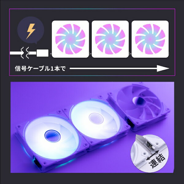 ケーブルレスで直接連結 ARGB LED内蔵 ケースファン■連結タイプのデイジーチェーンで配線すっきりファン同士を直接接続するデイジーチェーン設計により、1本の信号ケーブルで全てのファンを配線できます。最小限のケーブルしか使わないためこれまでの複雑な配線を解消し、よりすっきりとした配線にすることが可能です。■アドレサブルRGB LED搭載、中央部にはインフィニティミラーデザインを採用多彩な照明効果でPCケース内をドレスアップすることができます。各社のRGB LED制御に対応しているので、光り方や色の連携も可能です。また、合わせ鏡の仕組みを利用したインフィニティミラーにより、奥行きのある幻想的なライティングが楽しめます。■PWM制御対応で静音性と冷却性能を両立PWM(パルス幅変調)制御によりファンの回転数を細かく調整することができ、冷却性能を最大限に引き出しながら、不必要な騒音や電力消費を抑えることができます。■ベアリングに流体軸受けを採用ボールベアリングよりも動作音と発熱が少なく、低摩擦と低振動による低騒音化と30000時間の高寿命化を実現しています。■防振ゴムパッド付きファンの回転による振動を吸収・緩和する防振ゴムパッドを搭載。性能を損なわずに低騒音化を実現しました。■安心の1年保証本製品は1年保証付きです。ご使用中に万が一不具合などが発生した場合、無償で修理または新品交換を保証いたします。お客様が安心して長くお使いいただける製品品質と併せて、サポート体制もご用意しております。