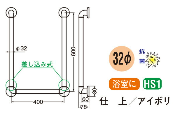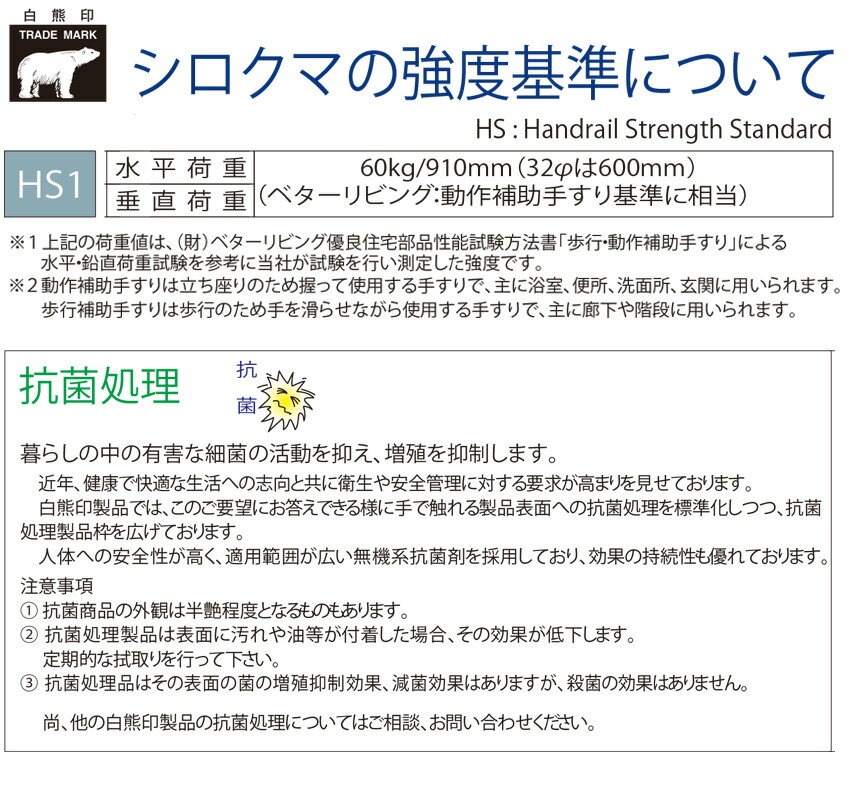 ブランド名:シロクマサイズ:-材質:アルミ抗菌樹脂コーティング+樹脂カラー/仕上:アイボリ付属ビス:A4×30 6×30ナイロンプラグ出荷日目安:通常、手配開始より1-2営業日目(※メーカー様欠品時は除く)。【※ご注文の際には必ず「全ての画像」「説明テキスト」「商品名(特にサイズ)」の確認をお願い致します。】 シロクマ製、補助手すり。 ・アルミに樹脂コーティングを施したタイプなので、浴室などに最適です。 ・握り部は抗菌アルマイト・抗菌樹脂コーティング仕上げ。丸棒の太さは32φ。耐荷重は60kgです。 【ご注意】 ※ユニットバスへの後付けの場合にはシロクマ様にお問い合わせください。※楽天市場店では、別サイトbidoorpal.comに準拠した商品画像やテキストを使用しています。その為、商品によっては、同一ページ内に他サイズや他仕様の情報が混在している場合がありますので、ご購入の際は、商品のサイズ・仕様等をよくご確認ください。※表記している納期は通常時の目安であり、納期を保証するものではありません。