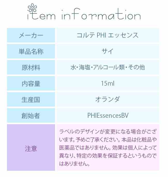 メーカー PHIEssencesBV シリーズ名 コルテPHIエッセンス 単品名称 サイ 原材料 水・海塩・アルコール類・その他 内容量 15ml 賞味期限 パッケージに記載 製造者 PHIEssencesBV 生産国 オランダ 輸入者 ネイチャーワールド(株) 資料提供 ネイチャーワールド(株) 使用上の注意 ラベルのデザインが変更になる場合がございます。予めご了承ください。 本品は化粧品や医薬品ではありません。 効果は個人によって異なり、特定の効果を保証するというものではありません。 広告文責 (株)B-CRUISE(0362724460)『自分の存在、意見を強く主張する手助け』 陽(陰陽の陽)のエネルギーを取り入れる。自分の存在、意見などを強く主張するのを助けてくれる。 ■使用方法 ・1回3〜4滴を1日3〜4回を舌の下に落とし数秒間とどめるようにして飲む。 ・お水やハーブティーに落として飲む。 ・気になる部分や脈、チャクラなど体の気になる部分につける。 ・エッセンスボトルを身に付ける。 ・お風呂に3〜4滴落として入浴する。 ・クリームや化粧品に混ぜて使う。 ※緊急時やエッセンスをとても必要とする時は量を増やすのではなく使用回数を増やしてください。 ※滴数はオススメの量です。自分が必要だと思った滴数をお取りください。 ■その他の使い方 ペットには飲み水や餌に混ぜて、植物にはじょうろの水に入れて与えることができます。 ■保存方法 直射日光を避け保管してください。