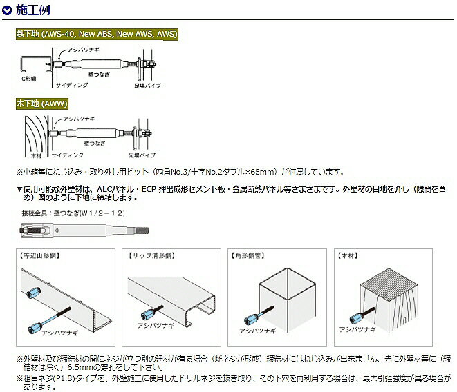 IIFAS FASTENING 商品説明 仮設足場部材 ナット可動式です。 接続ナット(4分)は、360度 方向に8度傾斜しても自由回転します。 つまり単純にネジとナットを連結しておりません。 壁つなぎに曲げ力がかかった場合、 ナットが傾斜するため、ネジの折損を防ぎます。 さらに安全のため、ネジ部分には折損 を防ぐ焼入れを採用しています。 ネジと接続ナットの部分(カーリング)の最大引 張強度は、2.000kgfを誇り、他に無い技術です。 使用可能な外壁材は、ALC板・ALCパネル・ECP 押出成形セメント板・金属断熱パネル等さまざまです。 壁つなぎとの接続は、壁つなぎを回転させずに、 接続ナット・雄ネジを締め付けて可能です。 ネジ頭部に採用してます四角穴は、カムアウト しない高トルク伝達設計で穴つぶれがありません。 New AWSタイプは、鉄下地1.6〜3.2に対応 させて開発した高強度を誇る高級ドリルネジです。 ※掲載商品の仕様、デザイン、生産国、発売時期は 予告なく 変更する場合がありますので、 あらかじめご了承ください。 ※掲載画像の色彩は実際の商品及び印刷物と 多少異なる場合があります。 ※メーカー希望小売価格はメーカーカタログに 基づいて掲載しています。 発送詳細複数ご注文、またはメール便対応商品をご注文の場合は、ショッピングモールからの自動メールでは送料は確定しておりません。店舗よりメールにて確定送料をお知らせ致します。こちらの商品(1点)の送料は下記のとおりです。 ご注文確定前に必ずコチラをご確認の上ご購入をお願い致します・ご確認ください・配送について・返品、交換について{カテゴリ} イイファス株式会社 光洋器材株式会社 シグテックファスナー SIGTEC FASTENERS 職人 機械 工具 電動工具 道具 仕事 建築 建設 大工 工事 現場 工業 作業 業務用 金物 部品 材料 住宅 接合 ファスナー ファスナーシステム ファスニングツール 留め ねじ ネジ ばね 釘 鋲 ピン アンカー ボルト ナット リベット 石膏ボード 硬質石膏ボード 金物 鉄下地 鉄骨造 リップ溝形鋼 等辺山形鋼 角型鋼管 仮設 足場 部材 木材 木造 WORK DIY PIN SCREW ANCHOR BOLT RIBBET NUT ACCESSORY ACC FASTENING TOOL