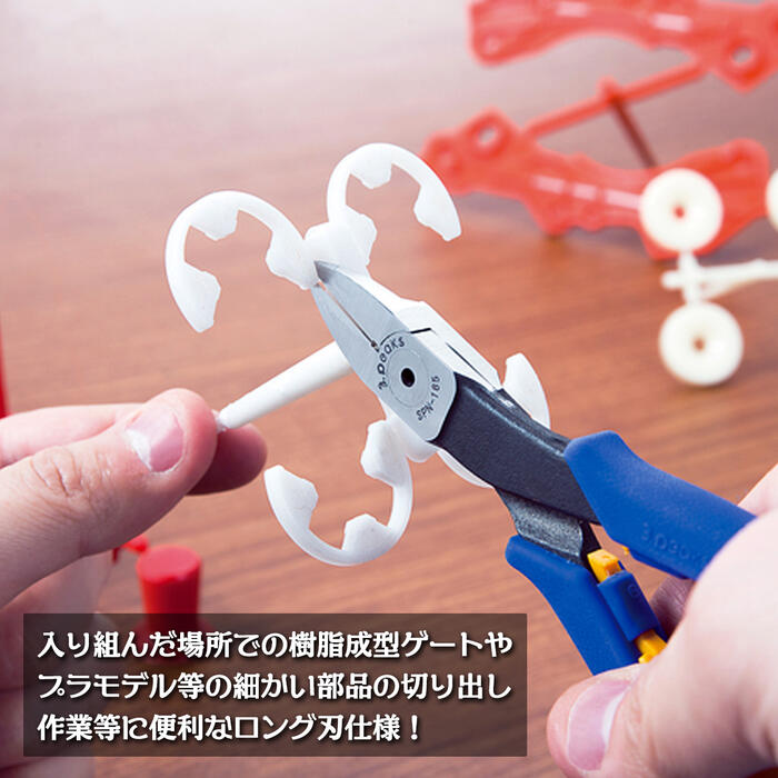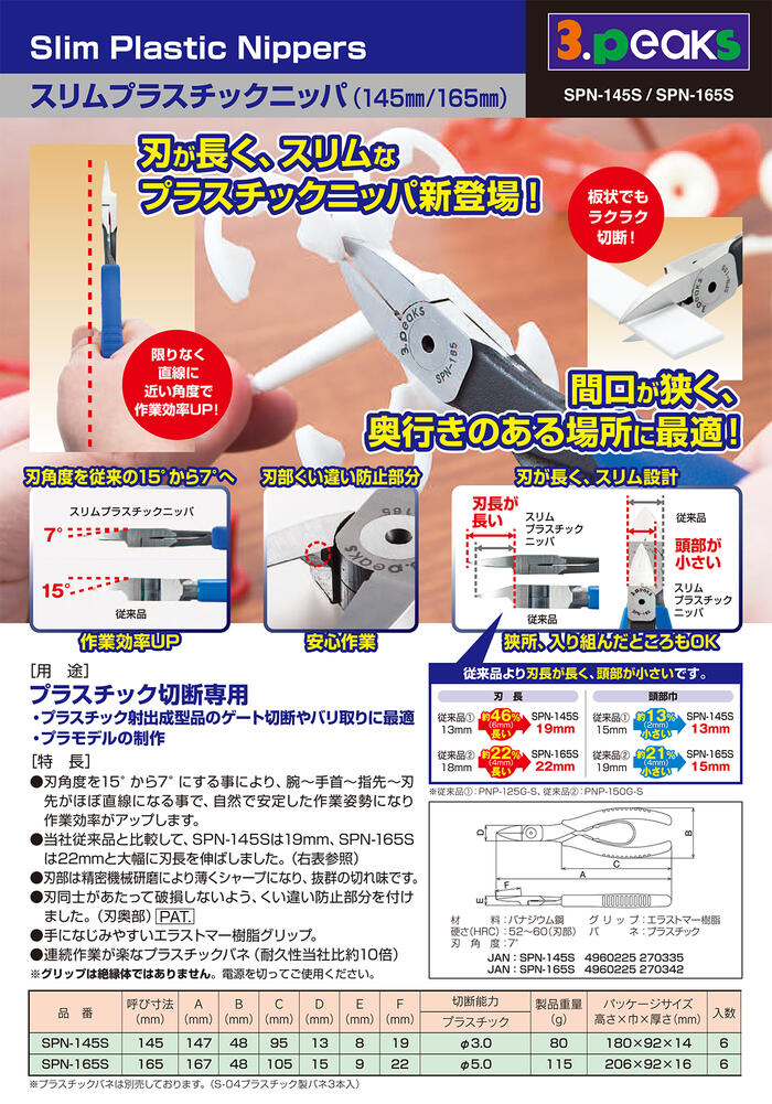 商品情報 メーカー スリーピークス技研品番 SPN-145S仕様・スペック 【サイズ】145mm【切断能力】プラスチックφ3mmまで【付属品】プラスチックバネ【刃角度】7°【生産国】日本■スタンダード品よりも刃が長く、薄い刃が特長のスリムタイププラスチックニッパ!●幅のある素材の切断も容易なロング刃仕様です。●刃面形状はフラット(平面)で美しい断面や切り口が特長です。●刃奥部にくいちがい防止ストッパーを装備。長期間の使用でも刃部がぶつかることがありません。●手になじみやすいエラストマー樹脂グリップを採用し、連続した使用でも手が痛くなりにくい仕様です。●連続作業が楽なプラスチックバネを採用。コイルバネよりも耐久性が高く超寿命が特長です。バリエーション【スリムプラスチックニッパーシリーズ】スリムプラニッパー 145mm (SPN-145S)スリムプラニッパー 165mm (SPN-165S)【交換用バネ】交換ばね ブルー (S-03)交換ばね レッド (S-03R)交換ばね オレンジ (S-04)ロング刃&スリム幅仕様で狭く入り組んだ場所や、一発で切りたい面の大きい樹脂成型ゲート等の切断に最適なスリムプラスチックニッパシリーズ! 【新潟県三条市発!職人が1丁ずつ丁寧に仕上げる、ゲート・ランナー・バリ切断に最適なプラスチック切断専用ニッパー】 2
