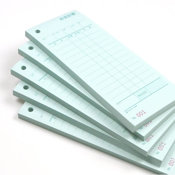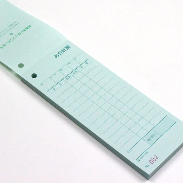 お会計票 75×177 1P ミズ色 No.入 ヒサゴのお会計票です。 001〜100までの通しナンバーが入ります。(ナンバー位置:伝票左下) 100枚ずつのりづけしてあります。 セット伝票(製本していないタイプ)になります。 その他の伝票はこちらから 入数 500枚 サイズ 75×177mm 複写枚数 単式