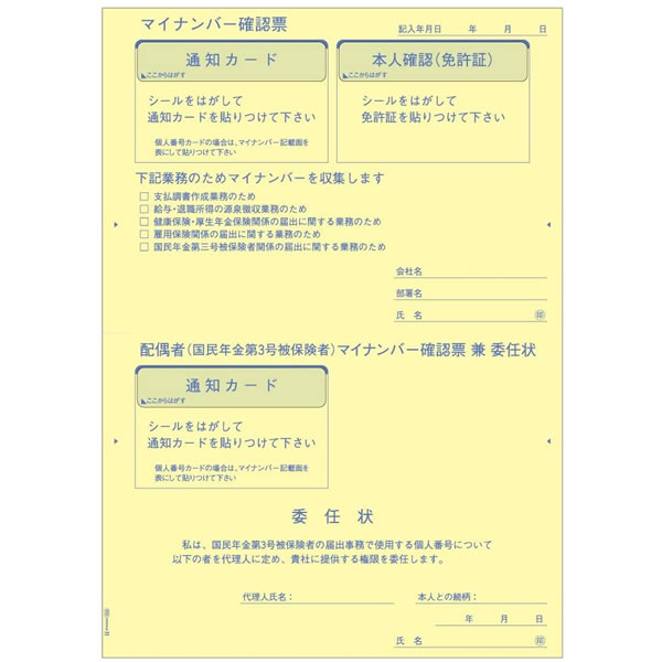 国民年金第3号被保険者マイナンバー収集用台紙(委任状付) マイナンバー制度で義務付けられている番号確認と本人確認、収集業務を効率よく実施できる台紙です。 本人の個人番号と本人確認書類、配偶者(国民年金第3号被保険者)の番号を同時に収集できます。 国民年金第3号被保険者のマイナンバーを収集する際に必要な委任状が付いています。 通知カード(個人番号カード)と、免許証を貼り付けてコピーすれば、統一したフォーマットで収集できます。 提出されたコピーをそのままファイリングして管理できます。 台紙の使い方の説明書付き。(コピーしてお使いください。) (登録新案取得済) その他のマイナンバー台紙はこちらから サイズ A4(210×297mm) 入数 20シート