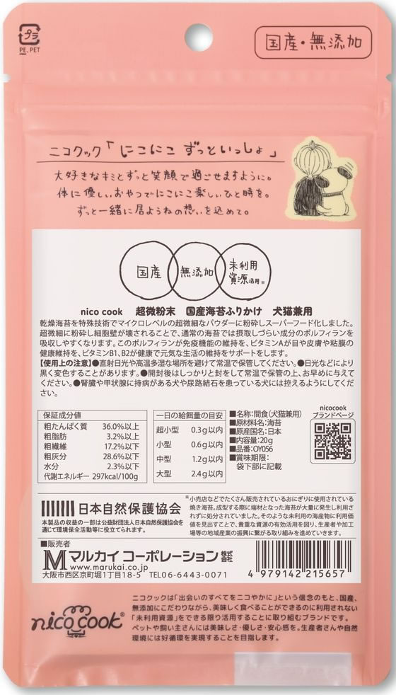 【商品説明】乾燥海苔を特殊技術でマイクロレベルの超微細なパウダーに粉砕しスーパーフード化しました。【仕様】●内容量:20g●原産国:日本【備考】※メーカーの都合により、パッケージ・仕様等は予告なく変更になる場合がございます。【検索用キーワード】マルカイコーポレーション まるかいこーぽれーしょん MARUKAI 超微粉末 国産海苔ふりかけ 犬猫兼用 ふりかけ nico cook ニコクック にこくっく 全犬種 成犬用 1歳から7歳 国産 無添加 小分け無し 20g ペットフード ドッグフード ドックフード エサ 餌 えさ ペット用品 犬 犬用 猫 猫用 間色 おやつ オヤツ E65373健康生活をサポートする海苔スーパーフード