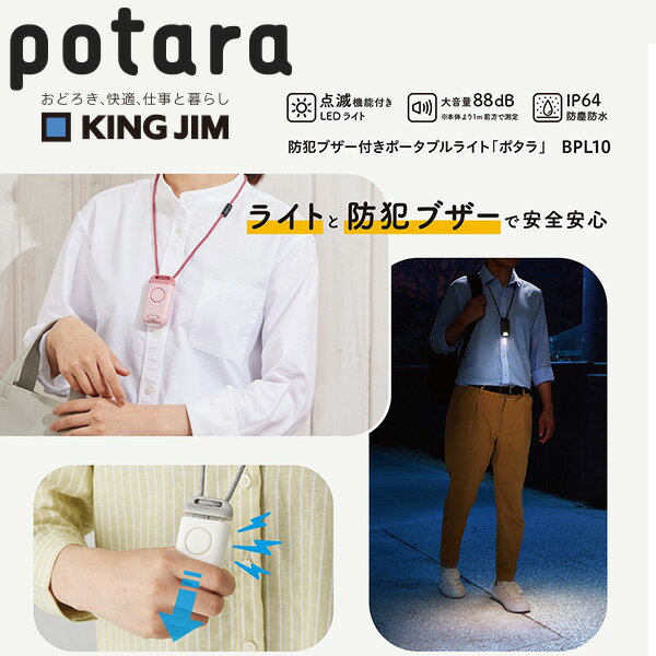 キングジム 防犯ブザー付きポータブルライト ポタラ BPL10 -W ホワイト / -BK ブラック / -P ピンク 防災ライト ネックライト LED懐中電灯 首かけライト 阪神防犯 大音量ブザー 88dB 災害対策 通学用 夜間散歩キャンプ 防犯グッズ 反射ストラップ ネックストラップ付き本体サイズ約W40×D20×H76mm(ストラップ長:約80cm)重量約43g(電池含む)光源白色LED×1灯(照度:17ルクス/m)防犯ブザー音量88dB、連続吹鳴時間:37分以上(試験値)モード切替点灯/点滅/消灯(スイッチ操作)防塵防水性能IP64(防塵:粉塵侵入なし、防水:水の飛沫に耐える)電源コイン形リチウム電池CR2032×2個(テスト用付属)電池寿命点灯:約15時間/点滅:約90時間使用温度範囲5〜35°C、湿度30〜80%(非結露)セット内容本体、テスト用電池2個、取扱説明書(保証書付)カラーホワイト / ピンク / ブラック特徴防災・防犯・日常のライト用途を1台でカバーできる多機能アイテムです。視認性の高いLEDライト、大音量の防犯ブザー、防塵防水の安心設計で、通学・夜間散歩・キャンプ・非常時など幅広く活躍。フェーズフリーの発想で、"いつも"と"もしも"をひとつにした頼れるネックライトです。フェーズフリー認証の防災アイテム「日常でも非常時でも使える」フェーズフリー認証商品。普段の生活で使い慣れておけば、災害時にも慌てずに対応できます。88dBの大音量 防犯ブザー搭載本体を引くだけで警報音が鳴る簡単操作。音量は88dB(1m前方)で、周囲に危険を知らせるのに十分な音量です。本体を元に戻すとブザーは停止します。LEDライト機能で夜間も安心白色LEDライトが足元をしっかり照らします(照度 約17lx/1m先)。背面スイッチで「点灯」「点滅」「消灯」の切り替えが可能。点滅モードは視認性向上に役立ちます。防塵防水仕様(IP64)粉塵の侵入を防ぎ、あらゆる方向からの水しぶきにも耐える設計。雨天時の使用や災害時の備えとしても安心です。ネックストラップ付き・ハンズフリーで使用可能首かけ用ストラップ付属で、両手がふさがっている状況でも使用可能。リフレクター付きで夜間の視認性も向上。事故防止パーツ付きで安全面にも配慮。メーカー希望小売価格はメーカーカタログに基づいて掲載しています。BPL10-W/ホワイト/4971660782758BPL10-BK/ブラック/4971660782765BPL10-P/ピンク/4971660782772