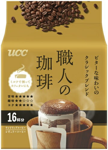 > こちらの商品の単品・まとめ買いはこちら【一個あたり 648円(税込)】【賞味期間】製造後13ヶ月【商品説明】深みのある余韻が特長。ミルクとの相性がよいビターな味わい。《風味の特徴》苦味・・・弱 ●●●●● 強酸味・・・弱 ●●◯◯◯ 強コク・・・弱 ●●●●● 強【名称および品名】コーヒー【原材料】コーヒー豆【保存方法】常温【製造者、販売者、又は輸入者】UCC上島珈琲株式会社【変更事項】ページリニューアル日:2025/08/27変更内容:パッケージ、容量(18杯分→16杯分)※北海道・沖縄県・離島(一部)へのお届けは決済時に送料無料となっていても追加送料が必要です。(コカ・コーラ直送を除く)北海道1個口 715円(税込)、沖縄県1個口 2420円(税込)※離島・一部地域は追加送料がかかる場合があります。追加送料の詳細は注文確定メールにてご案内いたします。※本商品はご注文タイミングやご注文内容によっては、購入履歴からのご注文キャンセル、修正を受け付けることができない場合がございます。変更・修正ができない場合は、メール、お電話にてご連絡をお願い致します。■ 法人・団体のお客様 大口購入のご相談承ります ■法人のお客様、各種団体のお客様で、まとまった数量でのご購入をご検討の際は、お気軽にご相談ください。お客様のご要望に合わせて柔軟に対応させていただきます。まずはお気軽にお問い合わせフォームよりご連絡ください。送料無料 コーヒー ドリップコーヒー 珈琲 レギュラーコーヒー ワンドリップコーヒー コーヒー豆 粉 レギュラー ドリップパック ドリップバッグ 一杯用 個包装 個包装コーヒー こーひー coffee ユーシーシー ブレンド ブレンドコーヒー お湯 注ぎやすい ゆーしーしー 16P 職人のコーヒー ビターな味わい クラシックブレンド 4901201157448