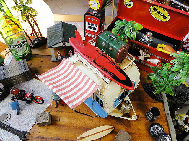 よく一緒に購入されている商品ワーゲンバス キャンピングカー ブリキオブジェ4,950円レトロな木製車輪 ウッドホイール アメリカン3,080円エッソボーイ ウッドサイン 木製看板 アメリカ5,280円 商品説明 今、アウトドアブームでキャンプギアがお店に豊富に並ぶ時代になりましたが、そんなアウトドアを自宅にいる時でも味わっちゃおうってのがコチラ! キャンピングカーをモチーフにしたブリキオブジェです。 アメリカではピックアップでキャンピングカーを引っぱっていってアウトドアを楽しむってカルチャーが昔からありますが、まさにそんなシーンをそのまま立体的にオブジェとして作っちゃったってヤツです。 古めかしい外装と、雰囲気のあるストライプのサンシェードを広げれるスタイルで、屋根を持ち上げると写真立てと小物入れが出現するという・・・・ 仕掛けまで付いてて、全体としてホントよくできてるの。 持ってるランタンなんかのアウトドアギアと一緒にリビングや玄関のスペースなんかに飾ると、自分の大好きな趣味の世界観を披露できて、これまた幸せな気分が味わえちゃうもんね! こんなキャンピングカーを題材にしたオブジェってそうそう出会えないので、見つけた時にゲットしておくのが絶対正解です。 そんなわけで、大好きなアウトドアシーンをインドアでも楽しみつくしちゃえ!(o ̄∇ ̄)o ※人や小物などの周りの演出物は付属しません。 サイズ 横12cm×縦23cm×高さ19cm(約) まだまだあります!「ブリキカー」はこちら 類似商品はこちらワーゲンバス キャンピングカー ブリキオブジェ4,950円シボレー ベルエア ストックカー ブリキオブジ6,820円ミニクーパー ブリキオブジェ アメリカン雑貨 4,840円サーフミニ ブリキオブジェ アメリカン雑貨 ア5,060円サーフミニ ブリキオブジェ アメリカン雑貨 4,840円シボレー ベルエア ストックカー ブリキオブジ6,600円ピザ屋さんの移動販売車 ブリキオブジェ アメリ7,040円サーフ仕様フィアット500 チンクエチェント 2,970円サーフトラック ブリキオブジェ Mサイズ 5,280円新着商品はこちら2025/12/3アメリカンアド ブリキケース ブリキ缶 小物638円2025/12/3アメリカンアド ブリキケース ブリキ缶 小物638円2025/12/3アメリカンアド ブリキケース ブリキ缶 小物638円再入荷はこちら2025/12/3海外SNSで話題! キモくてかわいいモンスター7,920円2025/12/3海外SNSで話題! キモくてかわいいモンスター1,980円2025/12/3海外SNSで話題! キモくてかわいいモンスター1,980円2025/12/03 更新