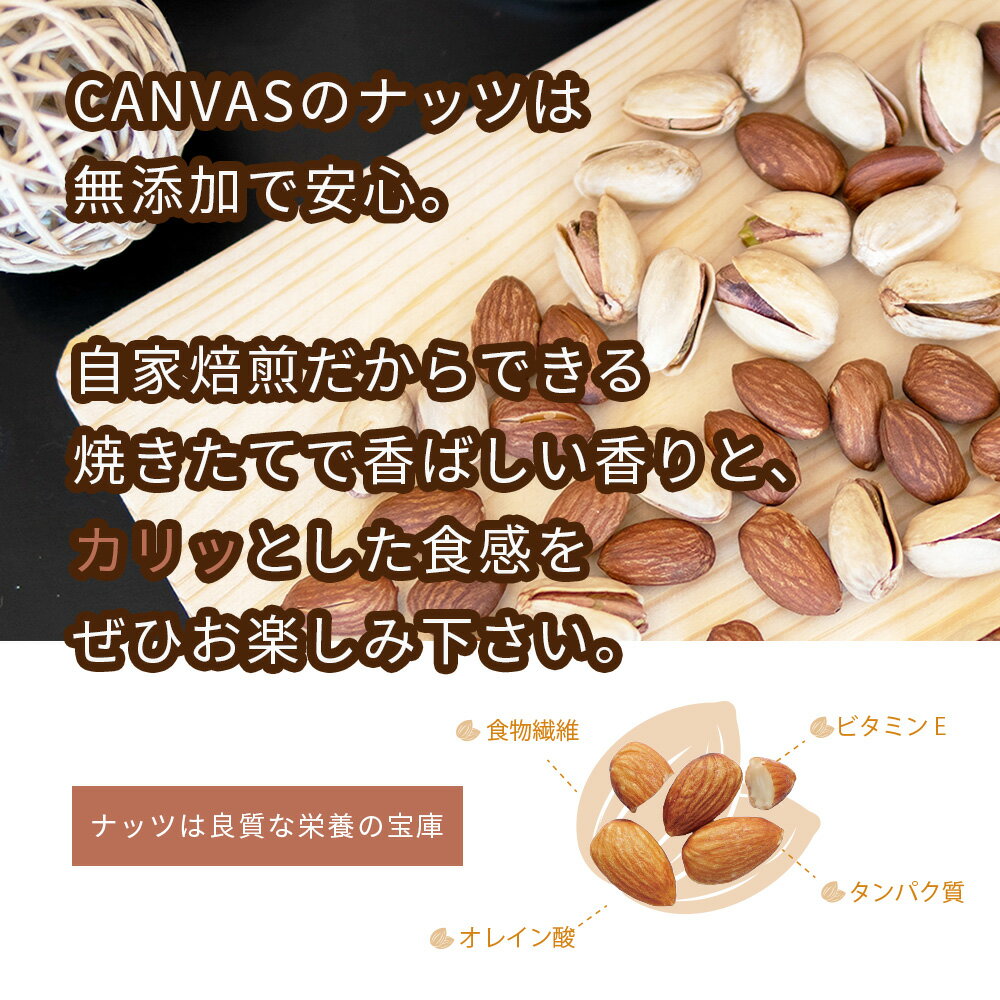 ふっくらした大粒、甘く優しい爽やかな味わいが特長のアメリカ カリフォルニア産。 CANVASのナッツは無添加で安心。 自家焙煎だからできる焼きたてで香ばしい香りと カリッとした食感を ぜひ一度おためしください。 受注後に焙煎し丁寧にハンドピック、焙煎したてをお送りします。 【価格改定のお知らせ】 昨今の原材料の高騰やインフラコストなどの上昇に伴い、当店ではこれまで品質の維持とサービス改善に努めてまいりましたが、現状の価格を維持することが難しくなりました。 大変心苦しいご案内となりますが、一部商品の価格変更をさせていただきます。 何卒ご理解くださいますようお願いいたします。