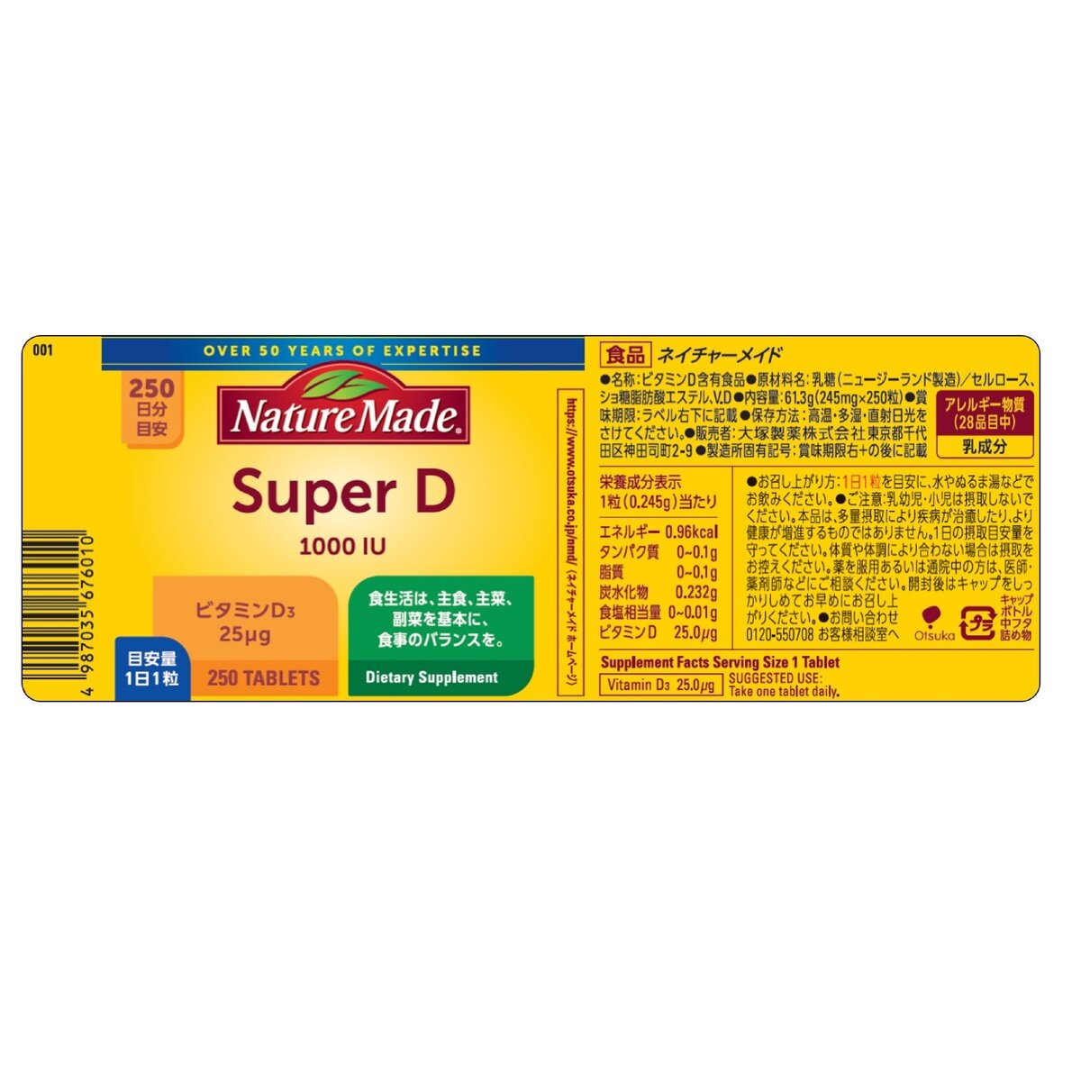 ネイチャーメイド スーパービタミンD 250粒 内容量 250粒(250日分/1日1粒目安) 主成分(1粒0.245g当たり) ビタミンD 25 µg (1,000 IU) 栄養成分表示(1粒当たり) エネルギー:0.96 kcal/たんぱく質:0-0.1 g/脂質:0-0.1 g/ 炭水化物:0.232 g/食塩相当量:0-0.01 g 原材料 乳糖(ニュージーランド製造)、セルロース、ショ糖脂肪酸エステル、V.D アレルゲン 乳成分 目安量 1日1粒を目安に、水などと一緒にお召し上がりください。 原産国 日本 商品詳細 ネイチャーメイド「スーパービタミンD」は、1粒で25 µg(1,000 IU)のビタミンDを補えるサプリメントです。 日光を浴びる機会が少ない方や、季節・生活習慣による不足が気になる方の毎日の健康管理におすすめ。 無香料・無着色、保存料無添加で、余計な添加物を抑えたシンプル設計。1日1粒で手軽に続けられます。