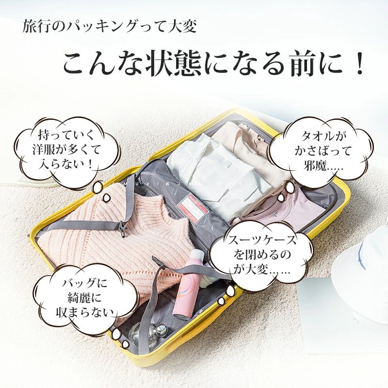 商品紹介 【最大60%スペース節約】 かさばる衣類があっという間にスッキリ!チャックを閉めるだけで約60%圧縮できるバッグです。見た目は小 さい圧縮バッグですが、実際は多くの衣類が入ります。旅行、出張やホテル泊などに最適な収納バッグです。 【防水防汚機能】 アレンジケースは耐久性のあるナイロン材料で作られ、水にも汚れにも強いです。万が一、水が掛かっても中の衣類は安心!少し濡れた衣類も収納することができる。これが非常に便利です!海水浴、ビーチ、温泉、サーフィン、ラフティング等にぴったりです。 【ファスナーで圧縮できるバッグ】 通常の圧縮袋とちがって、圧縮用の吸引機などがいらないため、かさばる衣類があっという間に小さいサイズに!チャックを閉めるだけで圧縮できるバッグです。旅行時のパッキングがしやすくなります。 【多用途性】 荷物が簡単に仕分け収納できます。服、タオル、化粧品、小物等に仕分けを整理します。旅行や出張だけではなく、家庭、温泉、スポーツ等の様々なシーンで楽に収納できます! 【持ち運びが簡単】 使用便利なハンドルが付き、手提げ可能です。サイズはぴったりして、旅行や出張の移動時にも大変便利。洗濯機に入れて丸洗いがOK。いつでも清潔に保つことが出来ます。 ご注意 ※実際の色味と写真の色味は光の当たり方やディスプレイの環境によって、多少異なる場合がございますのでご了承くださいませ。 ※製品品質向上、または製造時期により、予告なくデザイン及び仕様を変更する場合がございます。 ※生産過程におきまして、若干のサイズ誤差、個体差が生じる場合がございます。 ※サイトに掲載されている商品は、撮影の照明、またパソコンなどの環境により、画像と実際の商品の色味が多少異なる場合がございます。