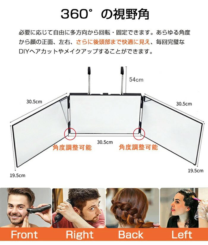 商品名: 三面鏡 壁掛け LEDライト付き カラー:ブラック、ホワイト サイズ:約240*60*350MM セット内容:三面鏡本体*1、USBケーブル*1、10倍拡大鏡*1、取り付け用フック*2 素材:ABS ご注意:ABSは温度変化により一定の熱膨張と収縮をします。温度の変化により、鏡を閉じると片側が浮いている場合がありますが、正常な現象です。 重量:約1500g 充電時間:約4時間 生産国:中国 360°の視野角 必要に応じて自由に多方向から回転・固定できます。あらゆる角度 から顔や頭などを快適に見え、毎回完璧なDIYヘアカットやメイク アップすることができます。 明かさ調節可能 ワンタッチでLEDライトをON/OFFにします。長押しすると明るさが 無段階調整可能で、朝方や夜など暗い時間帯にも気軽にメイクしたり、 髪を整えたり、髭を剃ったりすることはできます。 28個LEDライト 28個の高輝度ledライトになって肌の隅々まで照らし、光は均一で 柔らかく、より繊細なメイクを与えられます。 幅10MMまでの補助光が顔全体を照らす! 10倍拡大鏡付き 10倍拡大鏡付きなので、メイクをするときに局所的なメイク効果 をはっきりと見ることができます。アイメイク・ リップメイク などをよくチェック! 拡大鏡を直接鏡面に吸着することができます。 折りたたみ式ミラー 使用しない時は折りたたんでコンパクトに!ほこり・傷から守ることが できます。3面鏡だけではなく、普段使い用の卓上化粧鏡としてもお 使いいただけます。洗面台・化粧台・部屋・更衣室などに大活躍! 吊り下げ式&壁掛け お好みの高かさ(高さ調節可能:0-54cm)を自由に調節出来るのがポイント! ドア、ワードローブ、壁などの場所に簡単掛けることができ、テーブルやカウン ターの上においてそのままお使え、また、付属の無釘フックで鏡を壁に掛ける こともできます。 いろんな場所に大活躍 自宅で化粧、髭剃り、髪染め、パーマをしてもいいです。時間とお金を節約することはできます。 卓上ミラー ライト付き 卓上 三面 鏡 大きめ 鏡 壁掛け おしゃれ