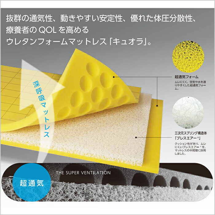 【キュオラ】ケープ 通気タイプ 防水タイプ通気カバータイプ防水カバータイプ●サイズ/重さ 通気タイプ CR-590:幅83×長191×厚10cm、6.5kg CR-591:幅83×長191×厚10cm、7.0kg CR-592:幅83×長191×厚10cm、6.1kg CR-593:幅83×長191×厚10cm、6.6kg 防水タイプ CR-594:幅83×長191×厚10cm、6.5kg CR-595:幅83×長191×厚10cm、7.0kg CR-596:幅83×長191×厚10cm、6.1kg CR-597:幅83×長191×厚10cm、6.6kg ●材質 マットレス(タイプ共通) 1層目/超通気高弾性ウレタンフォーム 2層目/三次元スプリング構造体ブレスエアー(制菌) 3層目/超通気高弾性ウレタンフォーム インナーカバー/ポリエステルメッシュ カバー(通気タイプ) 上面・側面/ポリエステルドライメッシュ(吸水速乾・制菌・消臭・伸縮) 下面/ナイロンオックス カバー(防水タイプ) 上面・側面/ポリウレタンフィルムラミネート加工布(防水・透湿・制菌・消臭・伸縮) 下面/ナイロンオックス ・抜群の通気性、動きやすい安定性、優れた体圧分散性。療養者のQOLを高めるウレタンフォームマットレス。 ・熱や湿気がこもらないダブル通気。 ・起き上がりやすい。 ・腰部を支え良い寝心地(頭部:やわらか、腰部:しっかり、足部:やわらか)。 ・内部ディンプル形状により圧縮ではなく変形させることで反力を軽減。 ・衛生対策:丸洗いが可能。優れた速乾性。 ・優れた耐久性。 関連商品はこちら【ディンプルマットレス】ケープ サイ...60,450円~60,450円【キュオラ】ケープ 通気タイプ 防水...94,046円~95,437円【ミルフィ】ケープ50,374円~50,374円【ホスピタマットレス】ケープ42,874円~42,874円【メリー&ハリー】ケープ49,738円~56,685円