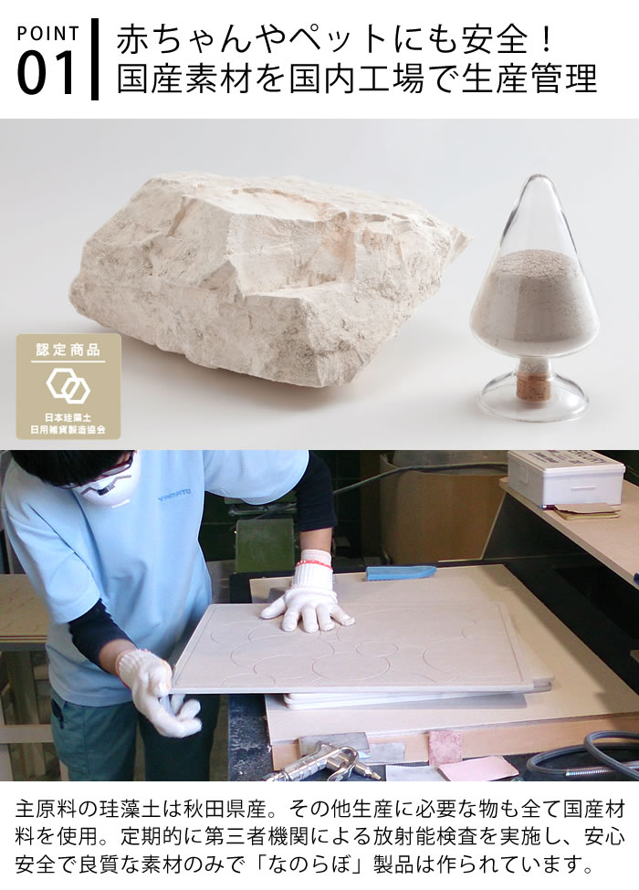 商品名なのらぼ 足快バスマット コンパクト リバーシブル関連商品→なのらぼ 足快バスマット レギュラー→なのらぼ 足快バスマット レギュラー リバーシブル→なのらぼ 足快バスマット コンパクト→なのらぼ 足快バスマット コンパクト リバーシブル→なのらぼ 足快バスマット ビッグ→なのらぼ 足快バスマット ピッコロ商品詳細サイズ約 43×34×0.9cm重量約1000g素材珪藻土・消石灰原産国日本備考■平らな面でご使用ください。段差がある場所や、敷物の上など、下地が不安定な状態で使用されますと、ゆがみによりひび割れの原因になります。■直接水のかかる浴室内でのご使用は避けて、脱衣所でご使用ください。■直射日光の当たる場所での放置や、暖房器具などによる急激な乾燥は避けてください。反りなどの原因になる恐れがあります。■この商品は天然素材で出来ています。色むら・斑点模様や軽微なキズなど残る場合がありますが、性能上問題ありません。検索キーワード 珪藻土バスマット なのらぼ 足快バスマット コンパクト リバーシブル W43×D34cm 両面使える 日本製 おしゃれ シンプル 速乾 調湿 清潔 足拭きマット 薄い 軽い 防ダニ 脱衣所 省スペース 単身 ギフト 新築祝 結婚祝ラッピングラッピングOK→詳細はこちらなのらぼ 足快バスマット コンパクト リバーシブル乗った瞬間から水滴が吸い込まれるコンパクトな珪藻土バスマット表裏使えるリバーシブルタイプお風呂上りの一番サッパリと爽快な瞬間に、ジメッと濡れたバスマットの上に乗ってちょっぴりゲンナリしてしまう事、これはお風呂の順番が最初の人以外は誰もが経験する切ないあるあるです・・・。そんな悩みをその力強い吸水力で解消してくれるのが、「なのらぼ 足快バスマット」です。世に珪藻土バスマットは数多くあれど、この商品は、珪藻土バスマットメーカーの老舗「MUマテックス株式会社」が、国産の原材料のみを用い、最高の技術で高品質の製品を作っているのでその信頼感は絶大です。どの珪藻土バスマット商品を選べば良いか迷っている方や、「以前に珪藻土バスマットを買った事はあるけど、イマイチだった・・・」という経験のある方にも、こちらの商品であれば自信を持ってオススメします!→なのらぼ商品一覧を見る→珪藻土バスマットスタンド一覧を見る