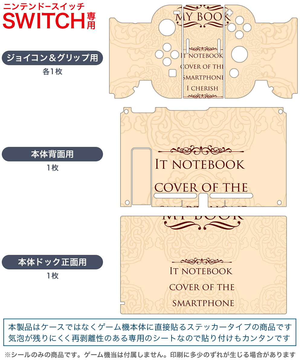 製品名 Nintendo Switch 本体裏面&ドック正面&ジョイコン専用 デザインスキンシール セット内容 Nintendo Switch 本体&ドック&ジョイコン用スキンシール(各1枚) ニンテンドースイッチ専用です。携帯機のSwitch LiteやProコンには対応していません。 商品特徴 再剥離性シートを素材に採用し、細かな位置調整がしやすく貼り直しが容易です。専用の業務プリンターを使い、商品画像と遜色のない美しい印刷仕上がり。 注意事項 画像はサンプルですので、ご覧の環境によっては多少色味に違いを感じる場合がございます。 イメージと違った、モニターと色味が異なるという理由での交換や返金はご対応出来かねます。スキンシールのみの販売で、ニンテンドースイッチ本体などは付属しません。シワができた場合、ドライヤーなどで軽く温め、外側に向けてシワを伸ばすように貼ってください。初回貼付時の位置調整や貼り直しは可能ですが、しっかりと押し付けて接着させた後の再剥離、再利用は保証しておりません。また接着部に油分や汚れが付着しますと角の部分は剥がれやすくなりますので、貼付時はあまり触れないようにご注意ください。無地のセミグロスシートにデザインをプリントした商品で、デコなどの加工はございません。 凹凸や光沢があるように見えたり布地や金属を素材にしたように見える商品もありますが、デザインの図版によるものです。印刷時に微妙な画像のズレが生じる場合がございます。ご注文後に1点1点制作する受注生産品の為、不良品以外のご返品や交換は固くお断りします。当店における繰り返しの実機テストでは問題ありませんでしたが、経過年数や使用環境により、シールを剥がす際に本体の塗装が一部剥がれる可能性があります。恐れ入りますが、万が一そのような状況になった場合でも当店ではゲーム機本体の保証は出来かねますので、予めご理解の上お求めください。 商品発送 完全受注生産のハンドメイド商品となりますので、既製品と比べて発送までお時間を頂いています。 基本的に決済確認後2?3営業日、最大で10営業日での発送となります。繁忙期や休業日明けの場合はさらに時間がかかる場合があります。 その際には別途メールにてご連絡致します。メール便の場合、発送日から到着までに2?4日ほどかかる場合が多く、紛失などの保障もご対応できかねます。あらかじめご了承下さい。