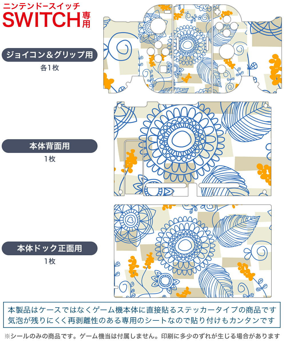 製品名 Nintendo Switch 本体裏面&ドック正面&ジョイコン専用 デザインスキンシール セット内容 Nintendo Switch 本体&ドック&ジョイコン用スキンシール(各1枚) ニンテンドースイッチ専用です。携帯機のSwitch LiteやProコンには対応していません。 商品特徴 再剥離性シートを素材に採用し、細かな位置調整がしやすく貼り直しが容易です。専用の業務プリンターを使い、商品画像と遜色のない美しい印刷仕上がり。 注意事項 画像はサンプルですので、ご覧の環境によっては多少色味に違いを感じる場合がございます。 イメージと違った、モニターと色味が異なるという理由での交換や返金はご対応出来かねます。スキンシールのみの販売で、ニンテンドースイッチ本体などは付属しません。シワができた場合、ドライヤーなどで軽く温め、外側に向けてシワを伸ばすように貼ってください。初回貼付時の位置調整や貼り直しは可能ですが、しっかりと押し付けて接着させた後の再剥離、再利用は保証しておりません。また接着部に油分や汚れが付着しますと角の部分は剥がれやすくなりますので、貼付時はあまり触れないようにご注意ください。無地のセミグロスシートにデザインをプリントした商品で、デコなどの加工はございません。 凹凸や光沢があるように見えたり布地や金属を素材にしたように見える商品もありますが、デザインの図版によるものです。印刷時に微妙な画像のズレが生じる場合がございます。ご注文後に1点1点制作する受注生産品の為、不良品以外のご返品や交換は固くお断りします。当店における繰り返しの実機テストでは問題ありませんでしたが、経過年数や使用環境により、シールを剥がす際に本体の塗装が一部剥がれる可能性があります。恐れ入りますが、万が一そのような状況になった場合でも当店ではゲーム機本体の保証は出来かねますので、予めご理解の上お求めください。 商品発送 完全受注生産のハンドメイド商品となりますので、既製品と比べて発送までお時間を頂いています。 基本的に決済確認後2?3営業日、最大で10営業日での発送となります。繁忙期や休業日明けの場合はさらに時間がかかる場合があります。 その際には別途メールにてご連絡致します。メール便の場合、発送日から到着までに2?4日ほどかかる場合が多く、紛失などの保障もご対応できかねます。あらかじめご了承下さい。