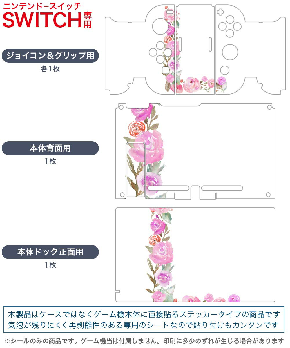 製品名 Nintendo Switch 本体裏面&ドック正面&ジョイコン専用 デザインスキンシール セット内容 Nintendo Switch 本体&ドック&ジョイコン用スキンシール(各1枚) ニンテンドースイッチ専用です。携帯機のSwitch LiteやProコンには対応していません。 商品特徴 再剥離性シートを素材に採用し、細かな位置調整がしやすく貼り直しが容易です。専用の業務プリンターを使い、商品画像と遜色のない美しい印刷仕上がり。 注意事項 画像はサンプルですので、ご覧の環境によっては多少色味に違いを感じる場合がございます。 イメージと違った、モニターと色味が異なるという理由での交換や返金はご対応出来かねます。スキンシールのみの販売で、ニンテンドースイッチ本体などは付属しません。シワができた場合、ドライヤーなどで軽く温め、外側に向けてシワを伸ばすように貼ってください。初回貼付時の位置調整や貼り直しは可能ですが、しっかりと押し付けて接着させた後の再剥離、再利用は保証しておりません。また接着部に油分や汚れが付着しますと角の部分は剥がれやすくなりますので、貼付時はあまり触れないようにご注意ください。無地のセミグロスシートにデザインをプリントした商品で、デコなどの加工はございません。 凹凸や光沢があるように見えたり布地や金属を素材にしたように見える商品もありますが、デザインの図版によるものです。印刷時に微妙な画像のズレが生じる場合がございます。ご注文後に1点1点制作する受注生産品の為、不良品以外のご返品や交換は固くお断りします。当店における繰り返しの実機テストでは問題ありませんでしたが、経過年数や使用環境により、シールを剥がす際に本体の塗装が一部剥がれる可能性があります。恐れ入りますが、万が一そのような状況になった場合でも当店ではゲーム機本体の保証は出来かねますので、予めご理解の上お求めください。 商品発送 完全受注生産のハンドメイド商品となりますので、既製品と比べて発送までお時間を頂いています。 基本的に決済確認後2?3営業日、最大で10営業日での発送となります。繁忙期や休業日明けの場合はさらに時間がかかる場合があります。 その際には別途メールにてご連絡致します。メール便の場合、発送日から到着までに2?4日ほどかかる場合が多く、紛失などの保障もご対応できかねます。あらかじめご了承下さい。