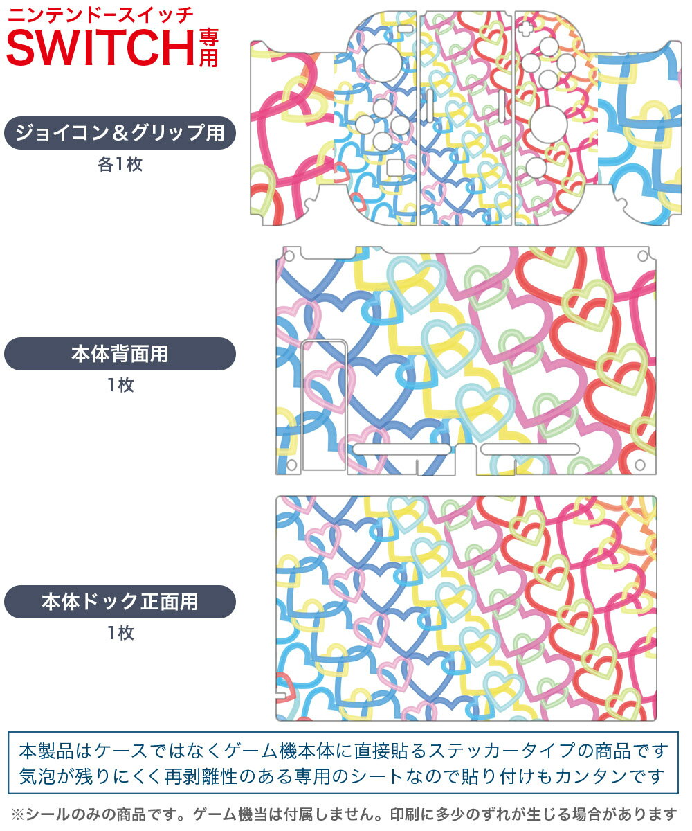 igsticker Nintendo Switch 用 デザインスキンシール 任天堂 ニンテンドー スイッチ 専用 本体ドック Joy-Con Joycon ジョイコン 専用 ゲーム機 カバー アクセサリー フィルム ステッカー 008294 カラフル レインボー ハート 模様