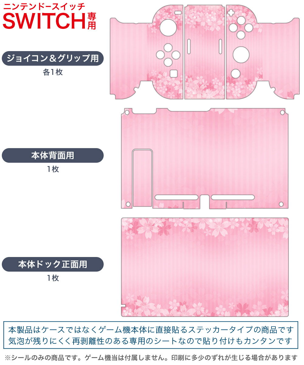製品名 Nintendo Switch 本体裏面&ドック正面&ジョイコン専用 デザインスキンシール セット内容 Nintendo Switch 本体&ドック&ジョイコン用スキンシール(各1枚) ニンテンドースイッチ専用です。携帯機のSwitch LiteやProコンには対応していません。 商品特徴 再剥離性シートを素材に採用し、細かな位置調整がしやすく貼り直しが容易です。専用の業務プリンターを使い、商品画像と遜色のない美しい印刷仕上がり。 注意事項 画像はサンプルですので、ご覧の環境によっては多少色味に違いを感じる場合がございます。 イメージと違った、モニターと色味が異なるという理由での交換や返金はご対応出来かねます。スキンシールのみの販売で、ニンテンドースイッチ本体などは付属しません。シワができた場合、ドライヤーなどで軽く温め、外側に向けてシワを伸ばすように貼ってください。初回貼付時の位置調整や貼り直しは可能ですが、しっかりと押し付けて接着させた後の再剥離、再利用は保証しておりません。また接着部に油分や汚れが付着しますと角の部分は剥がれやすくなりますので、貼付時はあまり触れないようにご注意ください。無地のセミグロスシートにデザインをプリントした商品で、デコなどの加工はございません。 凹凸や光沢があるように見えたり布地や金属を素材にしたように見える商品もありますが、デザインの図版によるものです。印刷時に微妙な画像のズレが生じる場合がございます。ご注文後に1点1点制作する受注生産品の為、不良品以外のご返品や交換は固くお断りします。当店における繰り返しの実機テストでは問題ありませんでしたが、経過年数や使用環境により、シールを剥がす際に本体の塗装が一部剥がれる可能性があります。恐れ入りますが、万が一そのような状況になった場合でも当店ではゲーム機本体の保証は出来かねますので、予めご理解の上お求めください。 商品発送 完全受注生産のハンドメイド商品となりますので、既製品と比べて発送までお時間を頂いています。 基本的に決済確認後2?3営業日、最大で10営業日での発送となります。繁忙期や休業日明けの場合はさらに時間がかかる場合があります。 その際には別途メールにてご連絡致します。メール便の場合、発送日から到着までに2?4日ほどかかる場合が多く、紛失などの保障もご対応できかねます。あらかじめご了承下さい。