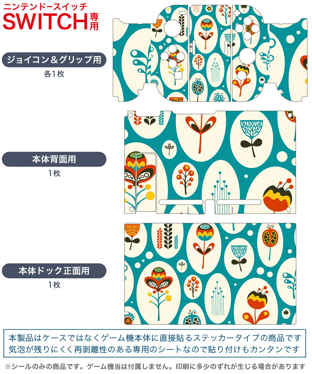 製品名 Nintendo Switch 本体裏面&ドック正面&ジョイコン専用 デザインスキンシール セット内容 Nintendo Switch 本体&ドック&ジョイコン用スキンシール(各1枚) ニンテンドースイッチ専用です。携帯機のSwitch LiteやProコンには対応していません。 商品特徴 再剥離性シートを素材に採用し、細かな位置調整がしやすく貼り直しが容易です。専用の業務プリンターを使い、商品画像と遜色のない美しい印刷仕上がり。 注意事項 画像はサンプルですので、ご覧の環境によっては多少色味に違いを感じる場合がございます。 イメージと違った、モニターと色味が異なるという理由での交換や返金はご対応出来かねます。スキンシールのみの販売で、ニンテンドースイッチ本体などは付属しません。シワができた場合、ドライヤーなどで軽く温め、外側に向けてシワを伸ばすように貼ってください。初回貼付時の位置調整や貼り直しは可能ですが、しっかりと押し付けて接着させた後の再剥離、再利用は保証しておりません。また接着部に油分や汚れが付着しますと角の部分は剥がれやすくなりますので、貼付時はあまり触れないようにご注意ください。無地のセミグロスシートにデザインをプリントした商品で、デコなどの加工はございません。 凹凸や光沢があるように見えたり布地や金属を素材にしたように見える商品もありますが、デザインの図版によるものです。印刷時に微妙な画像のズレが生じる場合がございます。ご注文後に1点1点制作する受注生産品の為、不良品以外のご返品や交換は固くお断りします。当店における繰り返しの実機テストでは問題ありませんでしたが、経過年数や使用環境により、シールを剥がす際に本体の塗装が一部剥がれる可能性があります。恐れ入りますが、万が一そのような状況になった場合でも当店ではゲーム機本体の保証は出来かねますので、予めご理解の上お求めください。 商品発送 完全受注生産のハンドメイド商品となりますので、既製品と比べて発送までお時間を頂いています。 基本的に決済確認後2?3営業日、最大で10営業日での発送となります。繁忙期や休業日明けの場合はさらに時間がかかる場合があります。 その際には別途メールにてご連絡致します。メール便の場合、発送日から到着までに2?4日ほどかかる場合が多く、紛失などの保障もご対応できかねます。あらかじめご了承下さい。